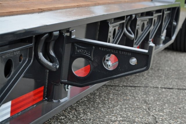 Tie Downs: 16 Total, Angled "D" Rings, 6 each side lower deck, one on end of each bolster, two (std. D-rings) at rear of Trunnion