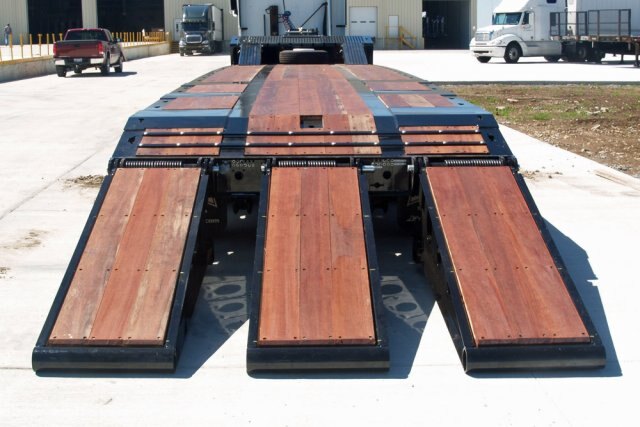 The Model 150 fixed gooseneck beavertail trailer with triple axle and 50 ton capacity was designed to haul light and heavy construction equipment without hydraulics. The Landoll 150 features a rugged four-beam frame design with a longer beavertail that reduces the loading angle. The beavertail is equipped with self-cleaning adjustable spring assisted flip over ramps.