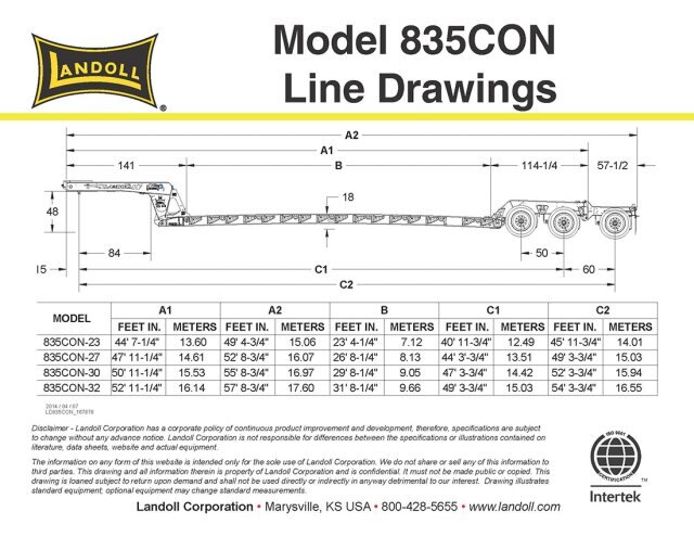 The Landoll 800 Construction Series’ versatility originates in its primary standard features. The new innovative 4-beam frame features a flat deck with a loaded height of 18". The 835C is a 2-axle, 70,000 lb. capacity with a 12’ concentrated deck rating. The 835 two axle frame is third flip axle ready. |