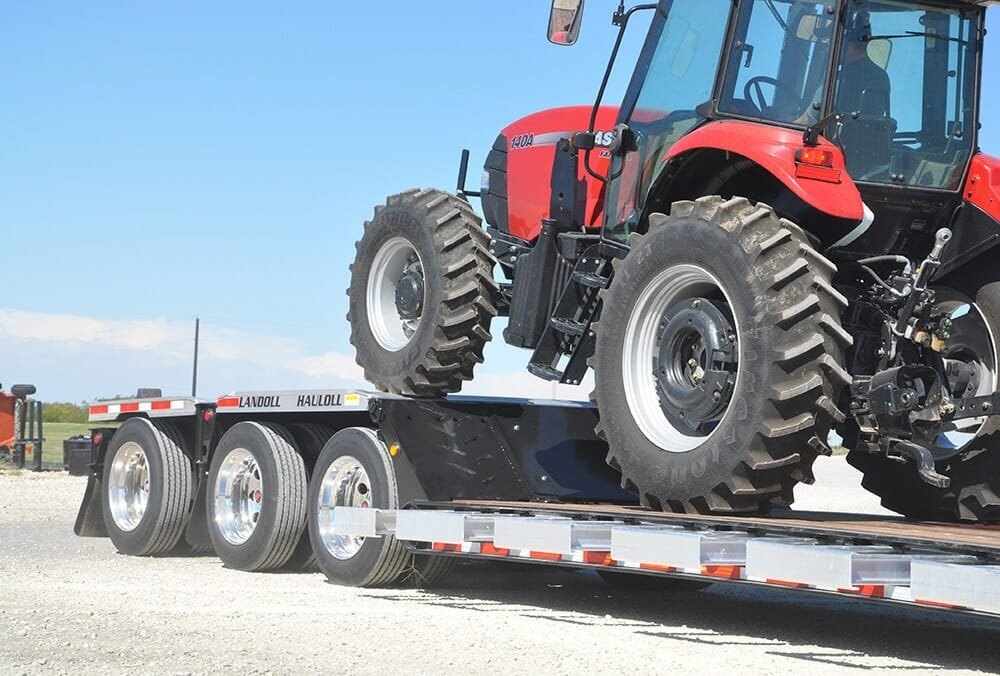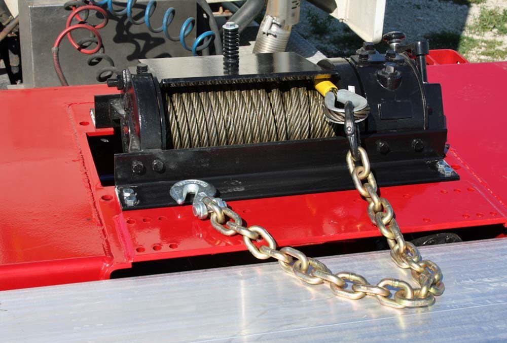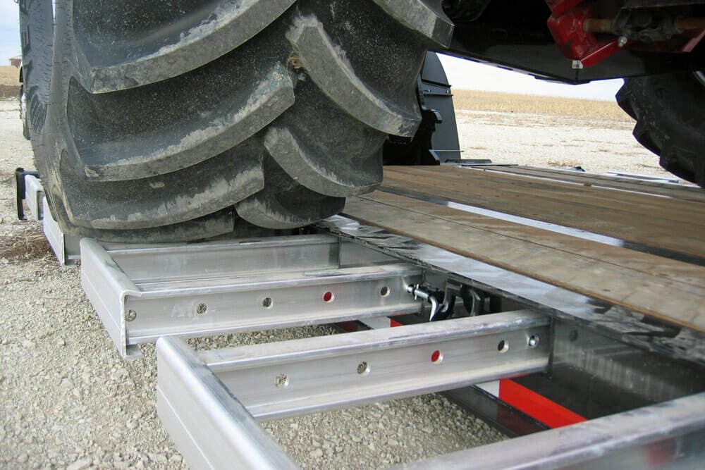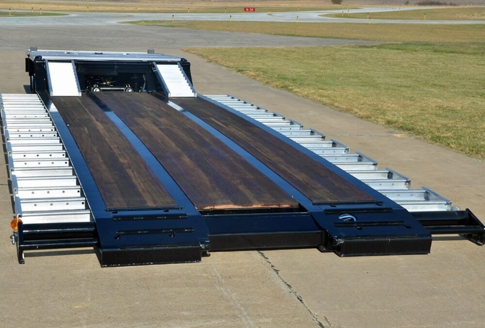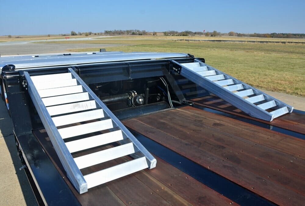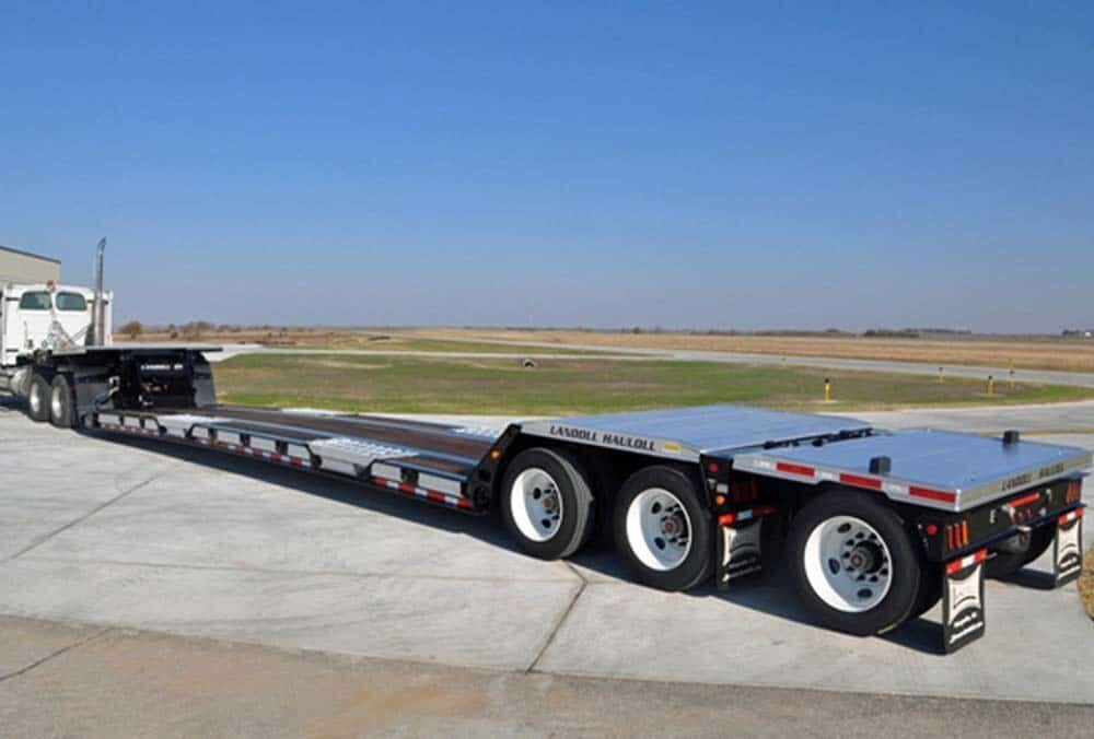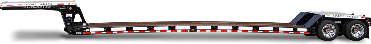 | Capacity* 35 Ton (70,000 lbs.) Deck Rating 60,000 lbs. in 12′ Estimated Base Weight 18,000 lbs., (835AG) +/- 3% Main Frame Fabricated 11 1/4″ Beam, 100,000 PSI Yield Flanges Deck Width 102″ Loaded Deck Height 18-1/4″ Loaded Ground Clearance 7″ Decking 1-1/2″ Apitong, Full Width Crossmembers 5″ x 3″ Rec. Tube on 18″ Centers Hitch Patented Automatic Gooseneck Lock Engagement Gooseneck 11′ 9″ Pin Setting 15″ Swing Clearance 84″ Side Extension 27″ Aluminum Telescoping Side Extensions (Lower Deck) Accessories 835AG – 48′, 51′ or 53′ Frame Prepared with Bkts, Electric and Air for 3rd Axle Flip Tool Box None Standard Gooseneck Tie Downs D-Rings: (2) Each at Front Corner; (2) Each at Back Lower Deck Tie Downs Side Mounted Nylon Strap / Chain Tie Downs; Side Mounted D-Rings on 36″ Centers Rear Trunnion Tie Downs D-Rings: (2) Each at Base Flush Mounted on Top of Inner Beams; (2) Each Web Mounted on Top; (2) Each Rear Flush Mounted on Top of Inner Beams; (2) Each Top of Slope (Outer web) |