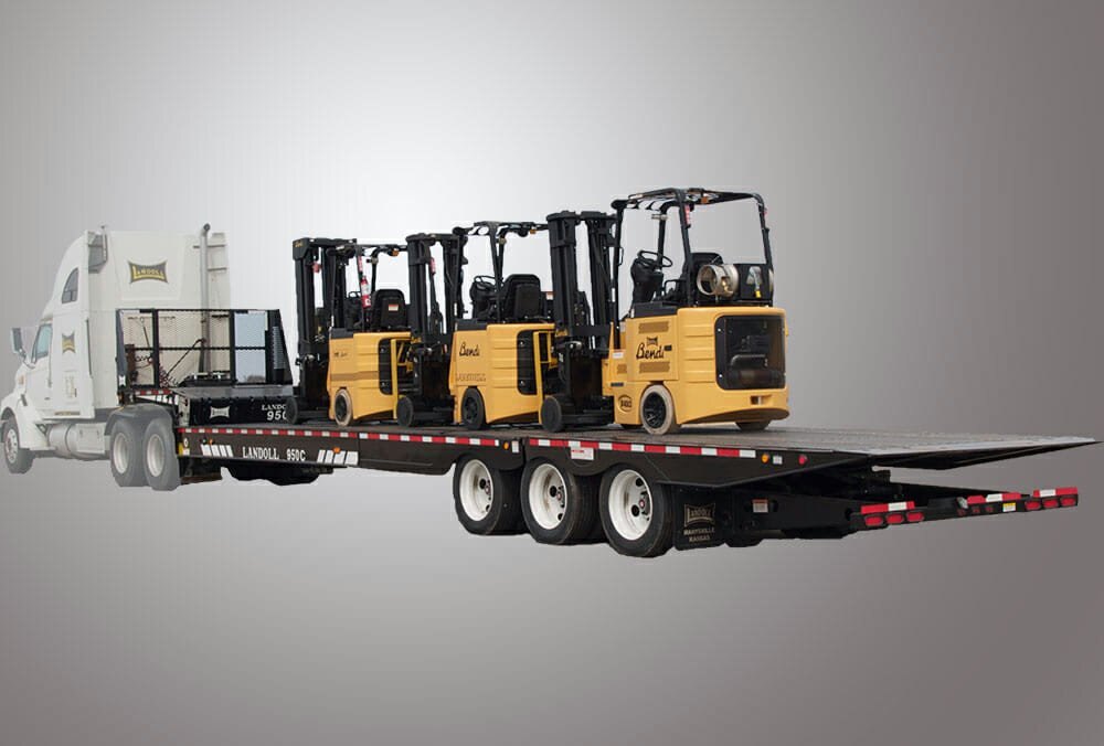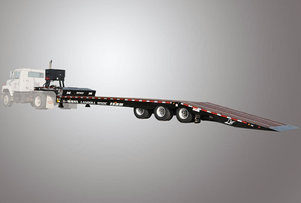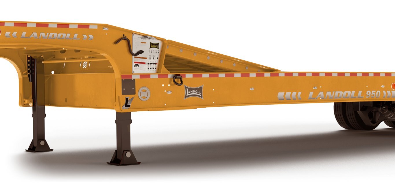 The 950E Traveling Tail Trailer has 50-ton capacity and three 25,000 lbs axles. It offers tail lengths of 12′ and 15′, and overall lengths of 45′, 48′ and 51′. It includes the same rugged four beam construction and other outstanding features of the 900 E-Series – standard powder coat paint, stable rigid dock arm, 24,000 lbs tail-lifting capacity and a centralized grease system. Landoll is the only trailer manufacturer to offer powder coat paint on large trailer frames.