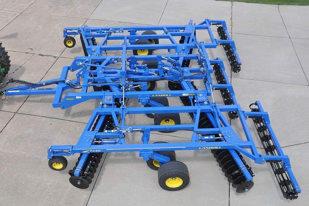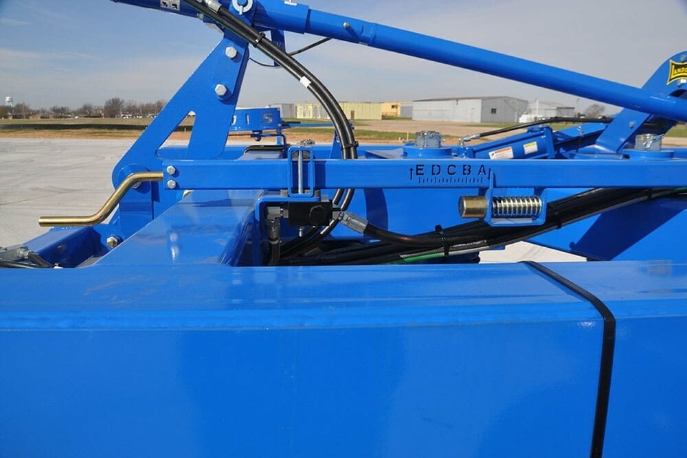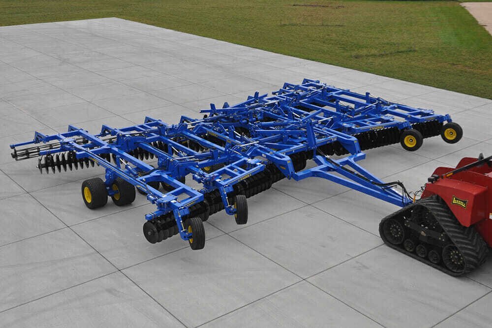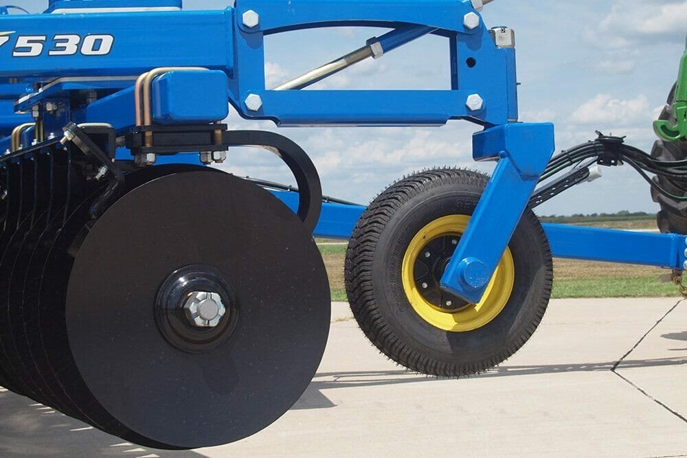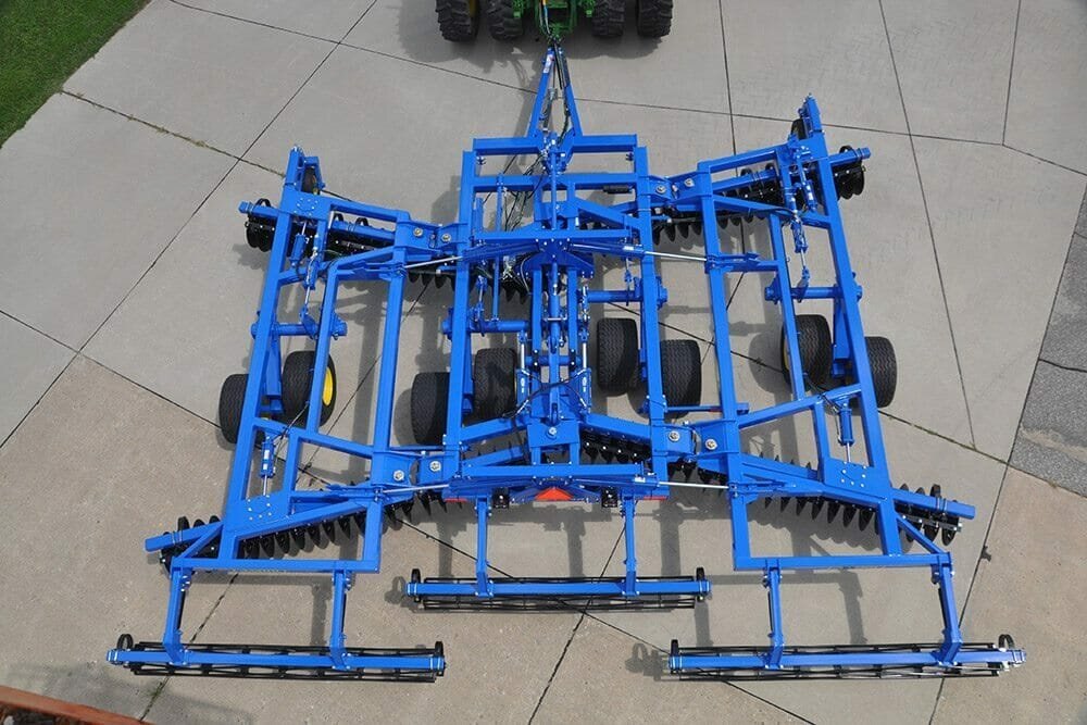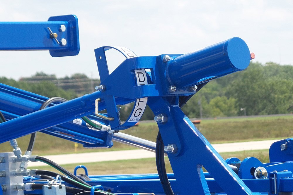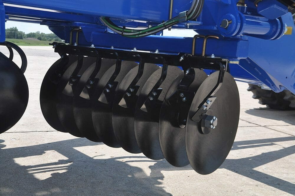 | Self-Leveling Hitch with Hydraulic Leveling Adjustment Cast Single Lip Hitch Cat. III or Cat. IV (Model Dependent) 14″ Diameter Chevron Reels with 7/8″ Round Rods and Spring Loaded Down Pressure Front Mounted Swivel Gauge Wheels on Wings Single-Point Depth Control Adjustment & Gang Wrenches Blue Powder Coat Paint |