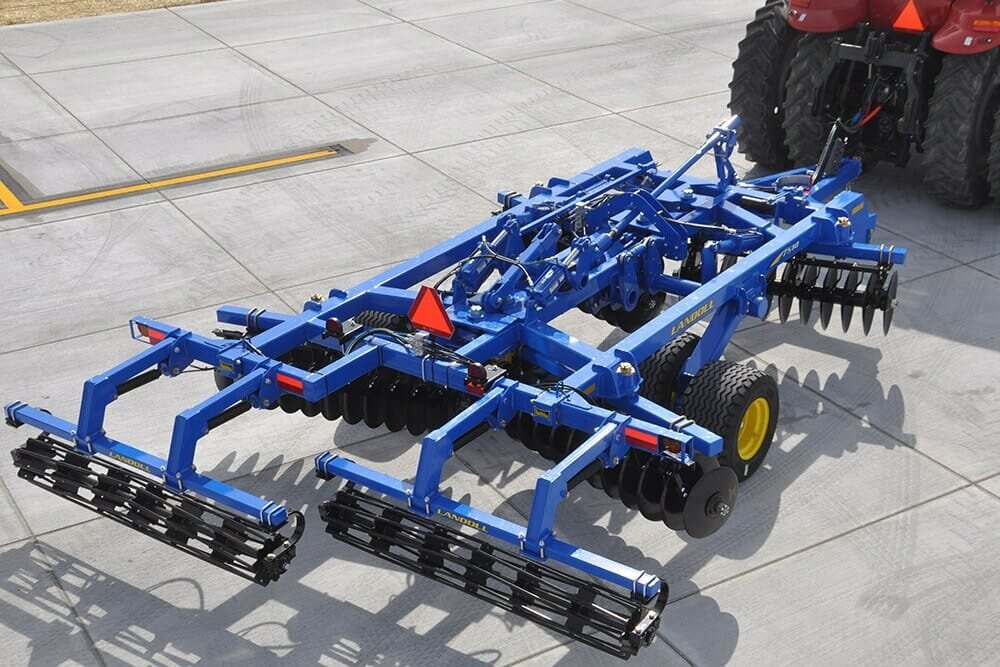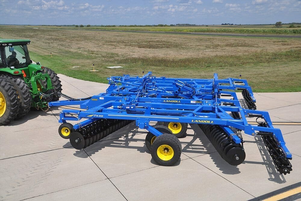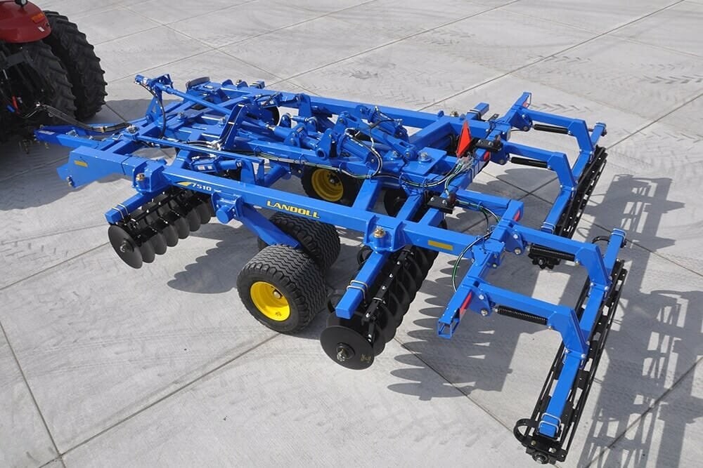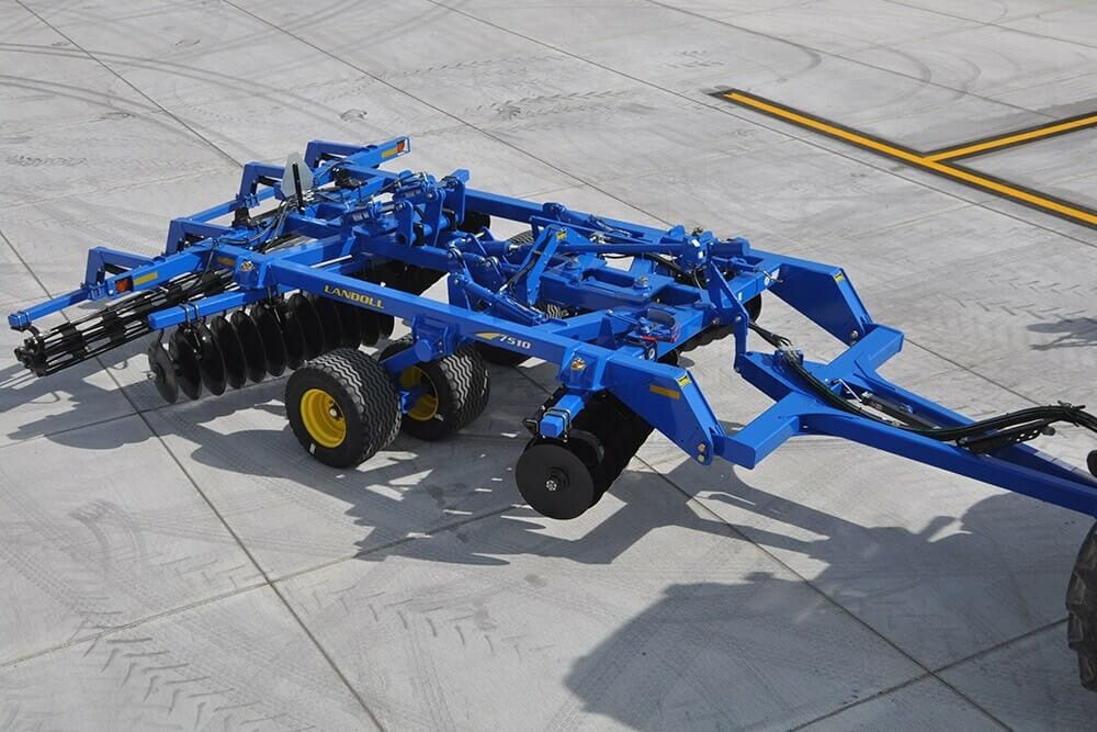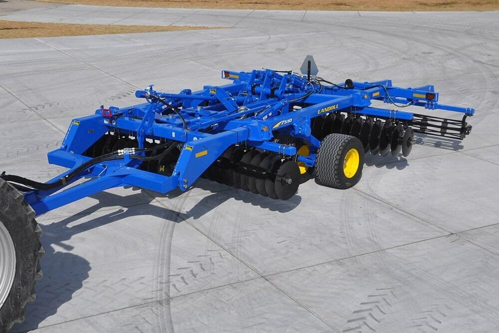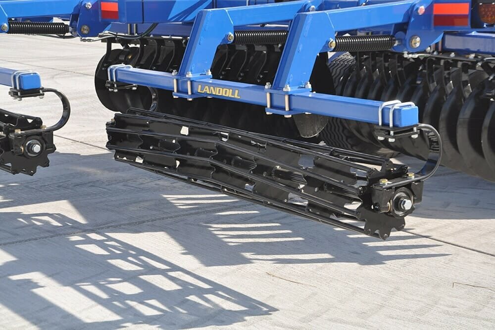 USER FRIENDLY AND BUILT TO LAST Every disc gang is equipped with C-flex hangers that provide cushion protection against rocks and other obstructions. The scraper bar is mounted to the C-flex hangers allowing scrapers and disc blades to move simultaneously with each other. The self-aligning feature of each trunnion bearing allows bearing realignment as the hangers flex and move. Bearings are triple-lip sealed and cannot be over-greased and are covered by Landoll’s three-year limited warranty policy. The rock shaft is protected by UHMW polymer which eliminates wear and maintenance requirements. Hinge joints are equipped with hardened pins that rotate on maintenance-free polymer bushings for improved machine performance and extended life of the hinge. Adjustments are user-friendly; hydraulically controlled fore to aft leveling can be adjusted on the go. Wing frame leveling is also simple and all adjustment wrenches are stored on the frame. And the innovative ease of adjusting the gang angle on the go from the tractor makes the 7500 VT Plus a user-friendly, simple but versatile vertical tillage unit built tough to perform for years to come. That’s the Landoll way! |