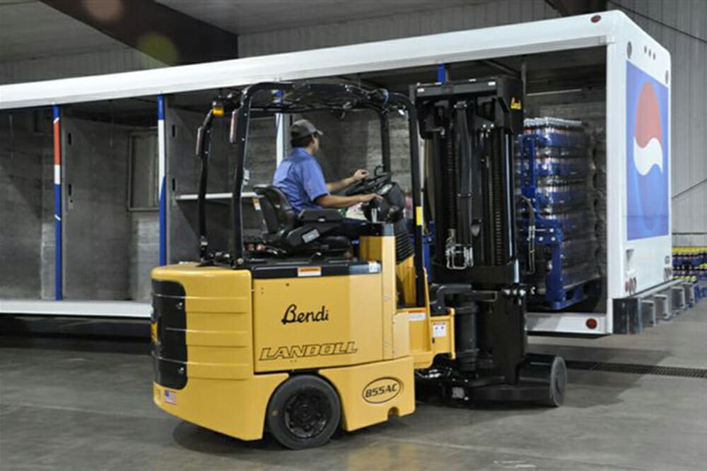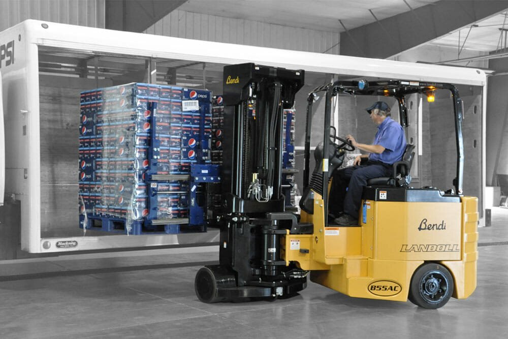 The versatile Bendi B55AC forklift replaces conventional reach and counterbalanced fork trucks in standard warehouse operations. The unique design allows operators to use it as a counterbalance truck indoors or out, while operating in narrow aisles in your warehouse, replacing reach trucks that require much wider aisles. The Bendi B55AC has large diameter tires and the truck has great underclearance for avoiding floor obstructions. One truck can go from inside the dock to the rack, eliminating staging and additional operators and support forklifts. |