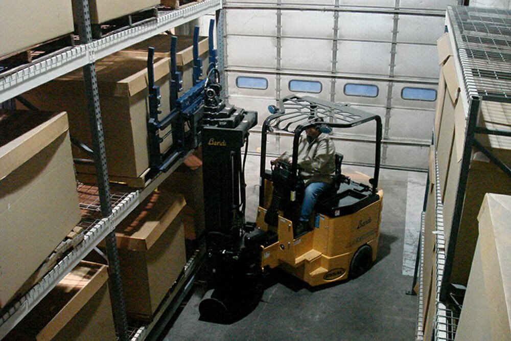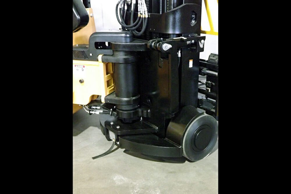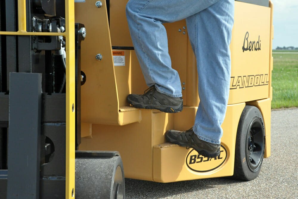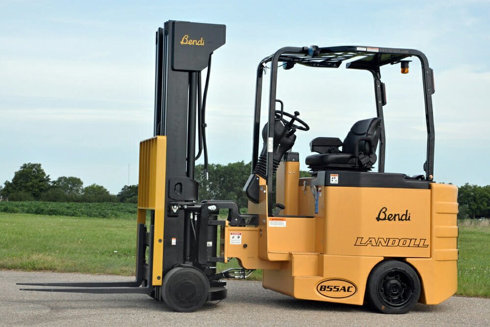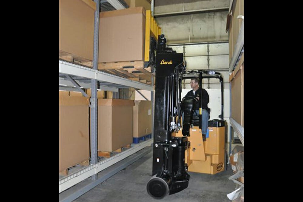 It’s a 4-wheel articulating forklift with dual independently driven rear-drive tires and soft-poly front load tires. Excellent traction, braking and power enable climbing steep ramps with loads. Three or four stage masts are available. The Bendi B55AC can work inside and outside on paved surfaces and have a floating front axle, allowing the truck to ride smoothly over uneven floors. It can do the same jobs as reach and counterbalanced trucks but with much heavier loads and in much narrower aisles. |