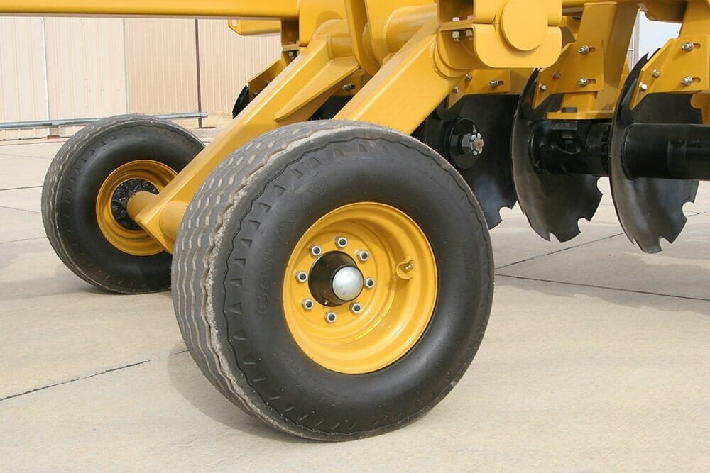 Built on an 8” x 8” and 8” x 6” x ½” wall, all-welded one-piece frame, the ICON 6510 Construction Disc can take what tough industrial construction jobs demand.  The frame is carried on a 5 1/2” lift axle with 1” wall thickness.  Maintenance-free UHMW bearings support the lift axle. Road clearance in transport is 11”.  The 4 1/2” diameter cylinders all have 2 1/2” cylinder rods.  Industrial rated hoses (4,300 PSI) are used throughout.  The disc gang uses a 2 1/2” gang bolt with nuts on both ends.  32” x 10 mm or 36″ x 12 mm notched blades are spaced 17 1/2” apart. C ast spacer spools that are 8 1/2” in diameter provide exceptional blade support.  719 lbs. per blade provides exceptional penetration capacity.  Gangs have oil bath bearings. Bearing supports are an integral part of the one-piece frame.  Adjustable scrapers keep the blades free from the build-up of material.