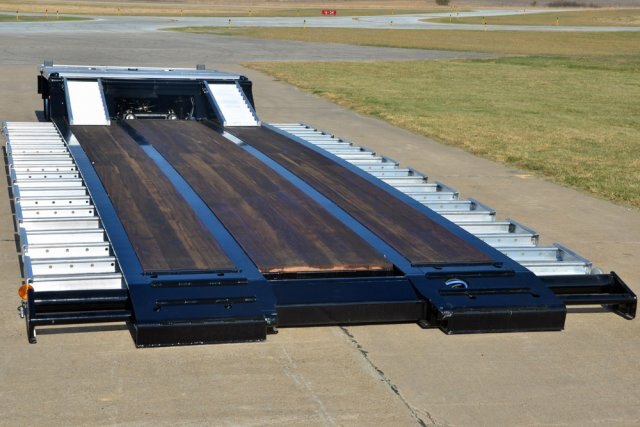 A single hydraulic control lever lowers, detaches and activates the patented gooseneck carrier arms, which allows the ease and simplicity of detaching and loading directly onto the lower deck which is only 11¼” off the ground. You will never have to drive up and over the trunnion again.