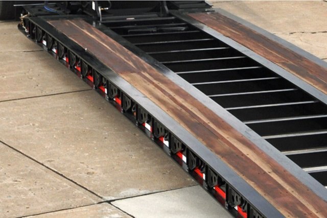 complete packageThe 800 Construction Series is the complete package. Maximum lower deck length allows you to position your loads and scale legally. For heavy loads, the base trailer comes standard with flip axle brackets and air/electrical couplers. To move a permit load with ease, an optional flip axle can be added. The 800C Series is work ready with a flattened front approach, apitong wood in track area, a recessed storage compartment and swing-out overwidth extensions. The front, double outrigger is for added strength at the break over. There are traction bars on the approach and on the front half bolster for added traction. |