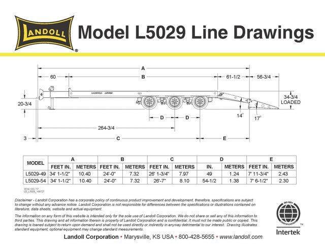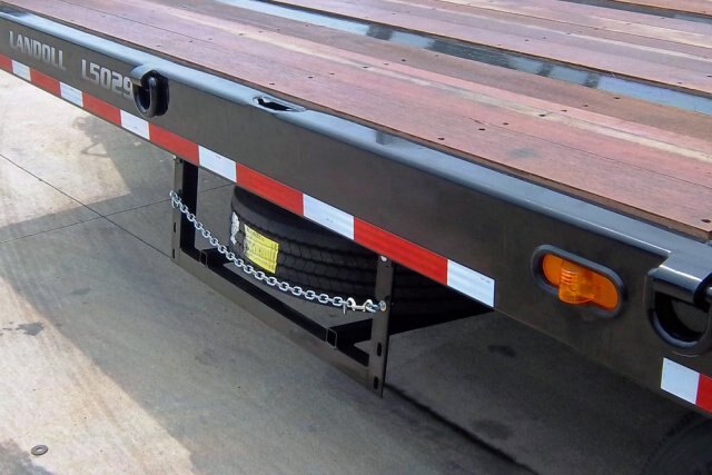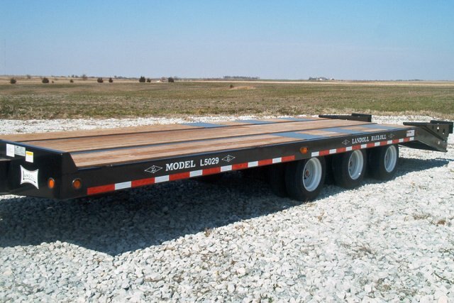 The Landoll Model L5029 is a triple axle 25 ton industrial tag trailer.  The trailer features a 24' flat deck and 5' beavertail and powder coat paint.  The mainframe is constructed of continuous I-Beam, 4" Jr. I-Beams on 12" Centers, 80,000# PSI and 9" deep formed side rails, plus many other high-end features found on Landoll trailers.