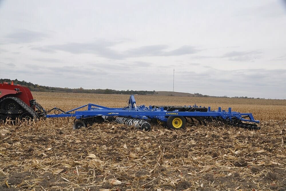 The Landoll WayLandoll’s solid reputation of building quality tillage equipment is built into every 2400 Series Weatherproofer 1. Precision, laser cut frame components embrace the technology of robotic welding to its fullest. Durability is built-in, not added on. Incorporation of UHMW polymer in the lift axles provides a maintenance-free feature that eliminates daily greasing. Trunnion mount bearings that are cushioned by c-flex mounts are used throughout the disc assemblies and are covered by a 3-year warranty. Heavy-duty coil spring auto-reset shanks allow 3,600 lbs. of point load with a 16” trip height. The self-leveling hitch and the single point depth control add to the list of items that extend the reliability of the Weatherproofer 1 beyond the competition. |