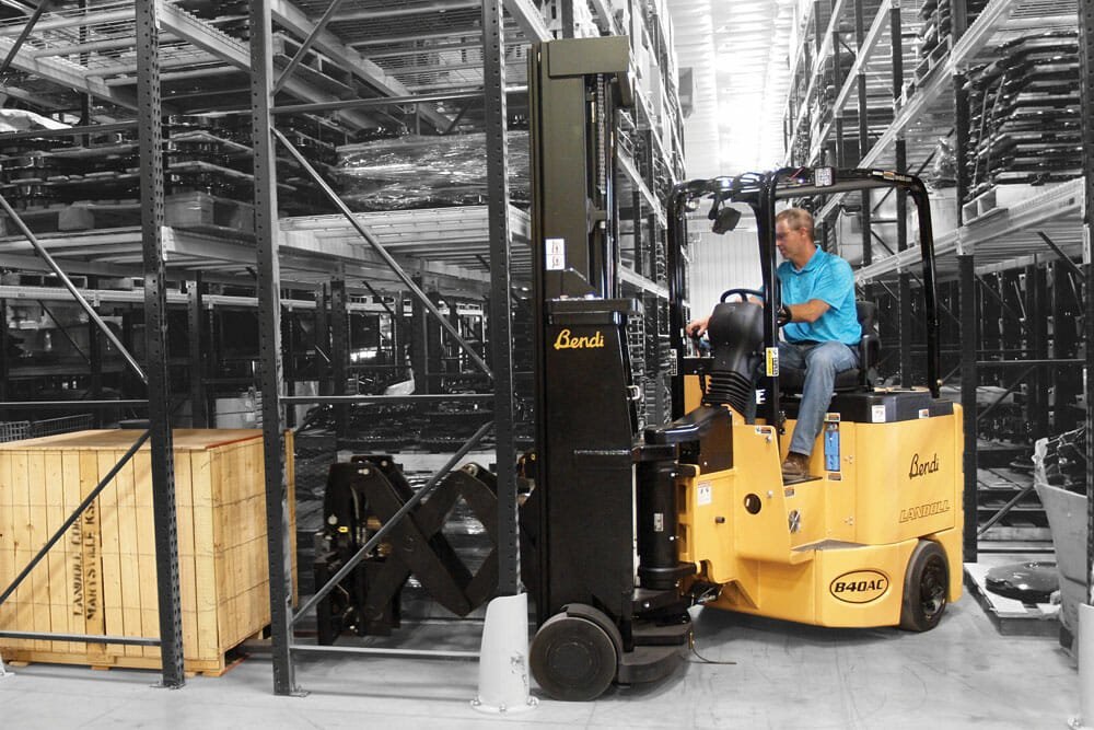 They are a 4-wheel articulating forklift with dual independently driven rear-drive tires and soft-poly front load tires. The Bendi B40AC-DR and B50AC-DR can work inside and outside on paved surfaces and have a floating front axle allowing the truck to ride smoothly over uneven floors. They can do the same jobs as reach and counterbalanced trucks but in much narrower aisles. |