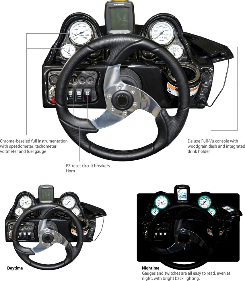 Although it’s hard to describe, something just feels right about a Legend console. It’s as if they adjust automatically when you sit down. The gauges are all easy to read even at night with their bright backlighting. Each switch is within reach and also backlit for clear night viewing. EZ-reset circuit breakers replace outdated glass fuses, just press to reset. The sleek custom-molded designs are mounted on strong aluminum sub-frames providing a solid foundation for excellent boat control. Some of our command centres even feature a built-in sink, tilt steering, a 12 volt outlet, integrated drink holders and a cell phone tray. |