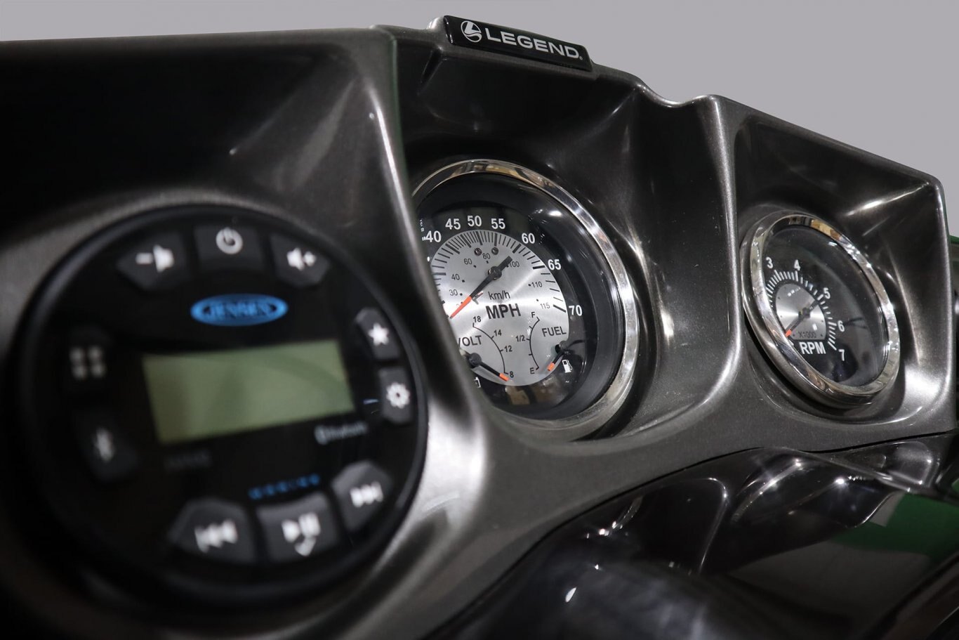 Gauges, Bluetooth stereo, switches, and Ram-mounted GPS fish finder. |