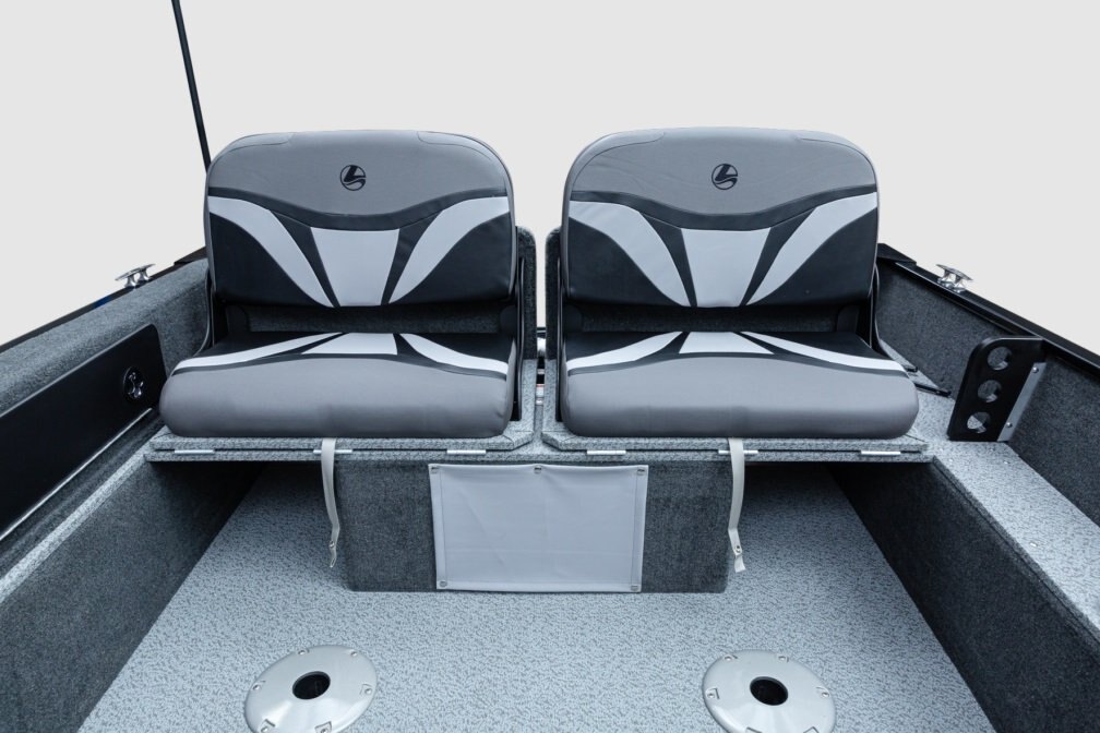Decks and Storage Rear battery storage area 5 drink holders Large port and starboard bow storage compartments Large bow center storage compartment Large rear casting deck with seat mount