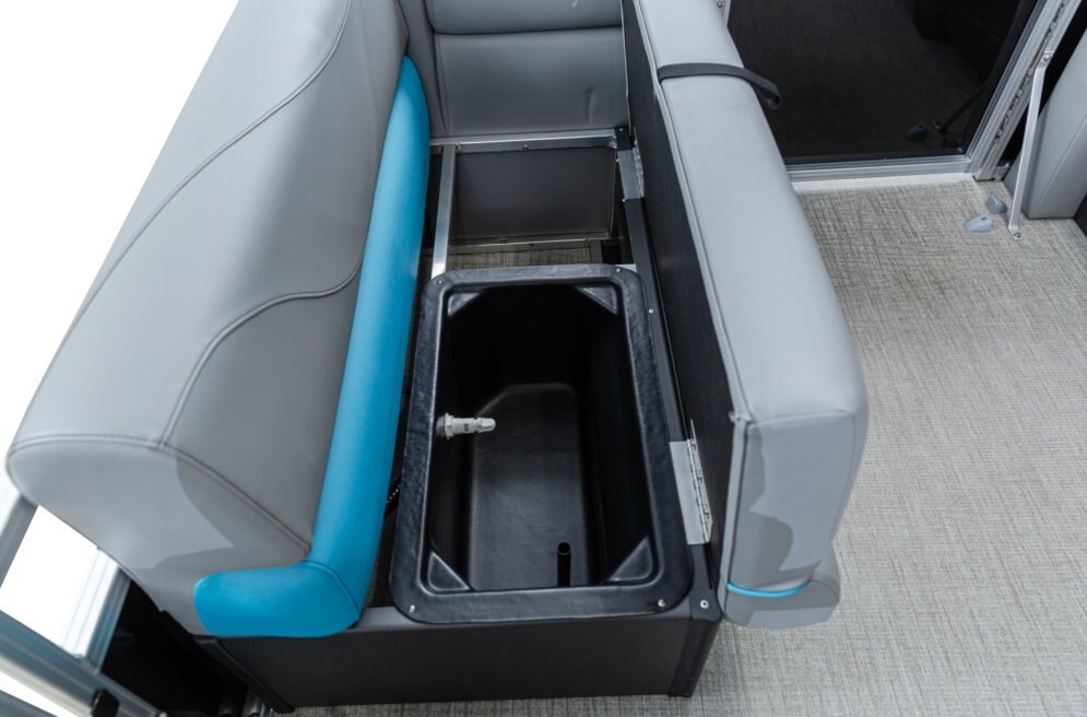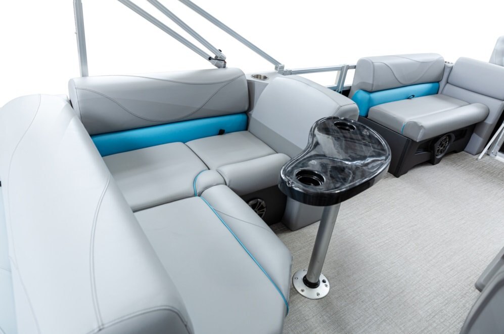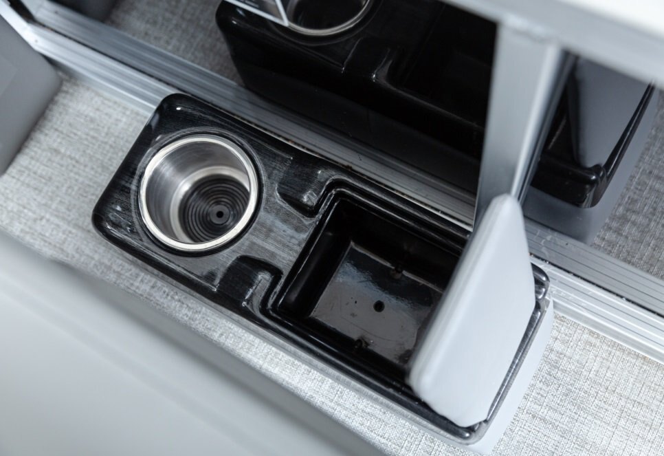 Decks and Storage Stainless cup holders Bow USB Charging Port Bow USB Charging Port Riptide Shadow Flooring Polished Corner Caps 4 U Bolt and Cleat Combo Small Greywood Kidney Table w/ Base Small Greywood Kidney Table w/ Base Charcoal Cladding Heavy Duty Rub Rail with w/Insert Privacy Station in Privacy Arm