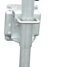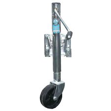 This jack is loaded with features.  Fully galvanized, 8″ diameter wheel for rolling ease, double pin locking mechanism, and a spring-loaded handle that swivels out of the way when not in use.