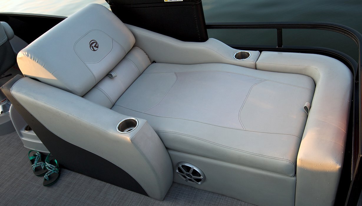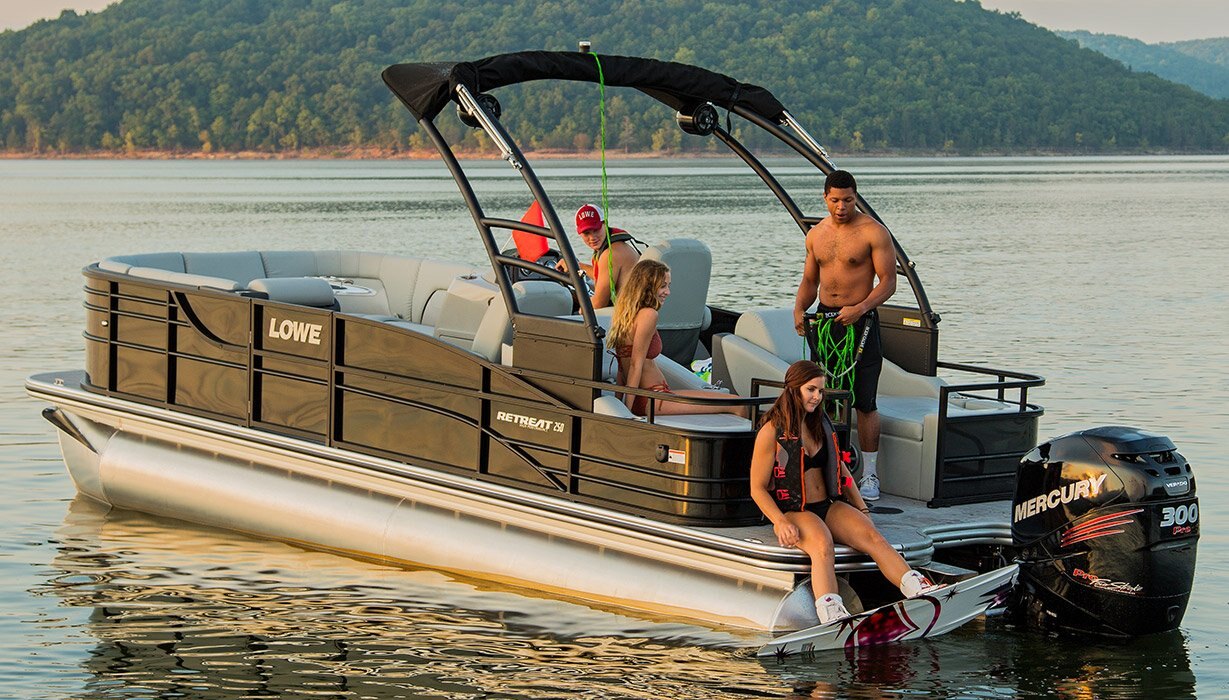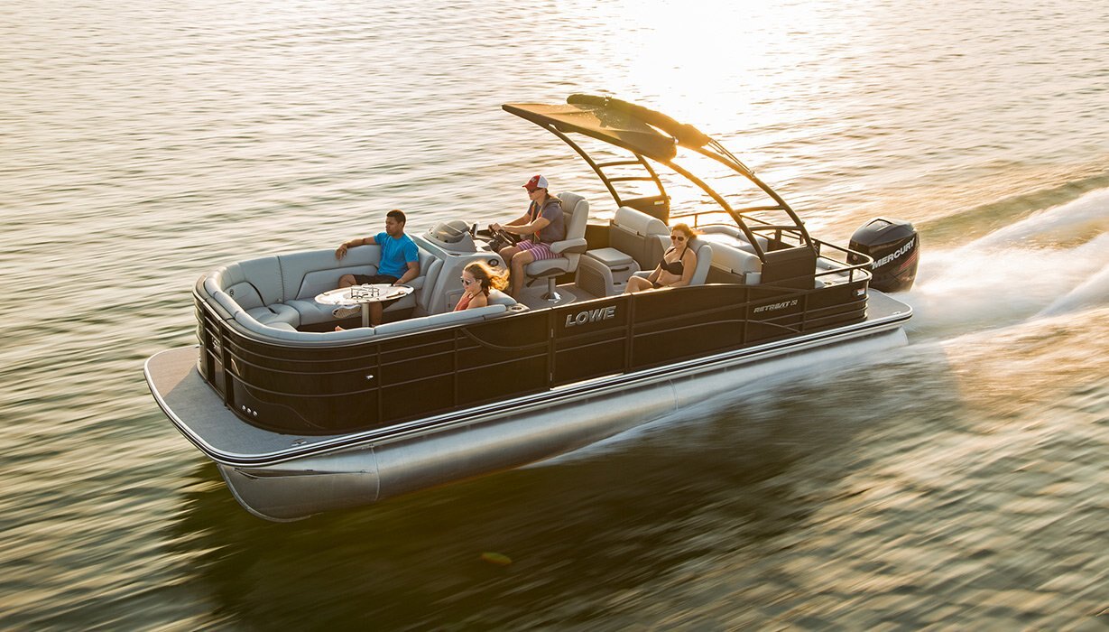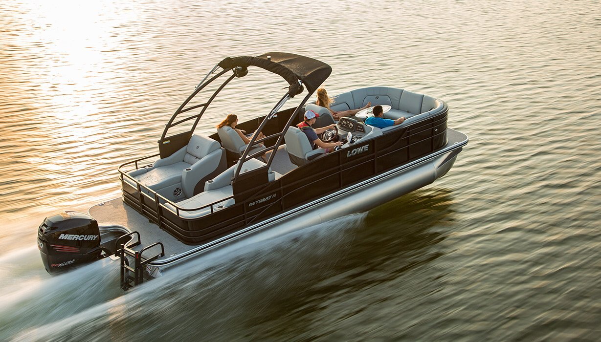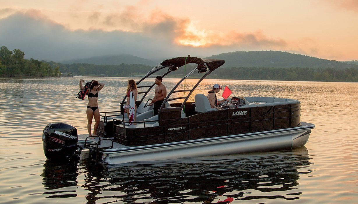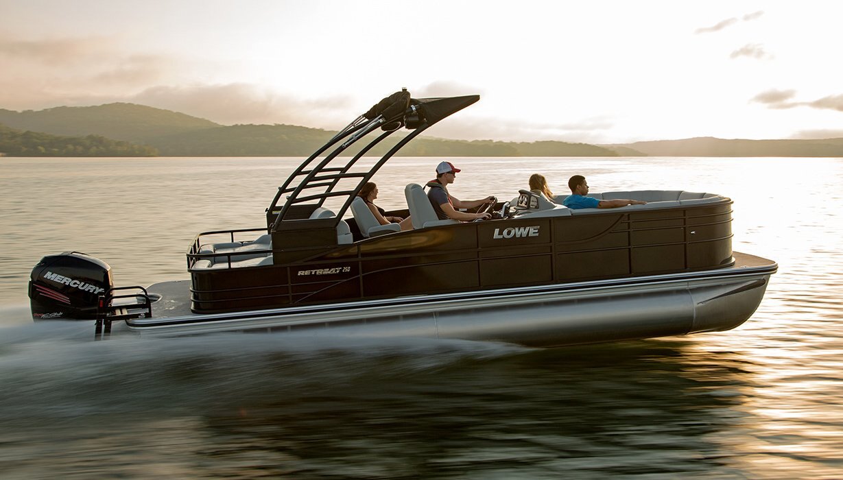 Escape the everyday with the Lowe Retreat 250 RFL! This deluxe pontoon features everything you could wish for in an on-water oasis: Plush rear-facing lounge seating with armrests at the stern provide uninterrupted views. Spacious seating throughout the pontoon also includes custom reclining helm and passenger seats, which swivel easily to join the conversation. A stylish plexiglass table includes convenient holders to keep your beverages secure, and a 9’ Bimini top lends welcome shade from the sun. Plus, because it’s a Lowe, you can count on durable construction and lasting quality for season after season of use. Crank up the Bluetooth®-compatible Marine Audio® stereo and hit the throttle—your own personal Retreat has arrived.
