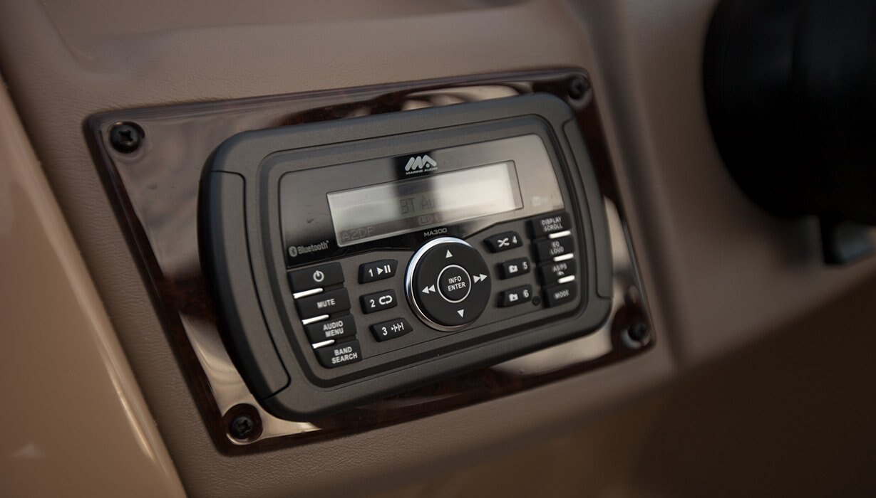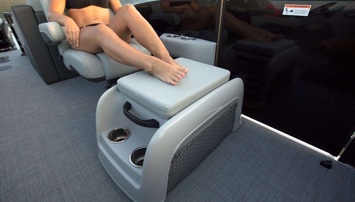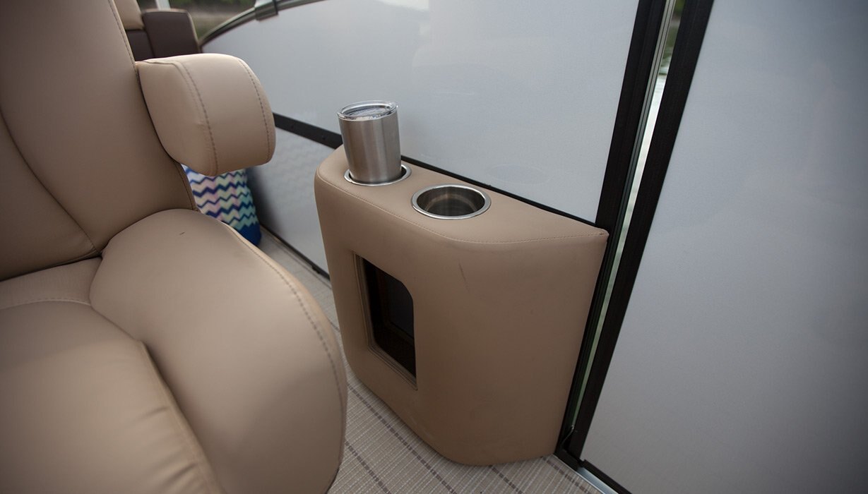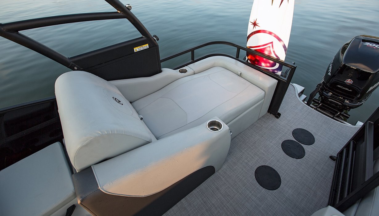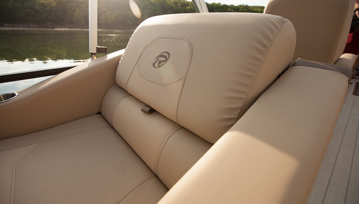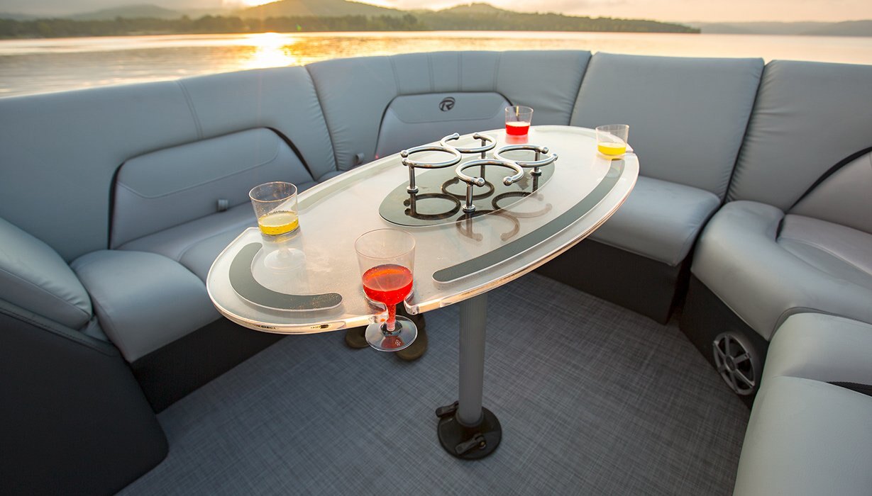 Escape the everyday with the Lowe Retreat 250 RFL! This deluxe pontoon features everything you could wish for in an on-water oasis: Plush rear-facing lounge seating with armrests at the stern provide uninterrupted views. Spacious seating throughout the pontoon also includes custom reclining helm and passenger seats, which swivel easily to join the conversation. A stylish plexiglass table includes convenient holders to keep your beverages secure, and a 9’ Bimini top lends welcome shade from the sun. Plus, because it’s a Lowe, you can count on durable construction and lasting quality for season after season of use. Crank up the Bluetooth®-compatible Marine Audio® stereo and hit the throttle—your own personal Retreat has arrived.