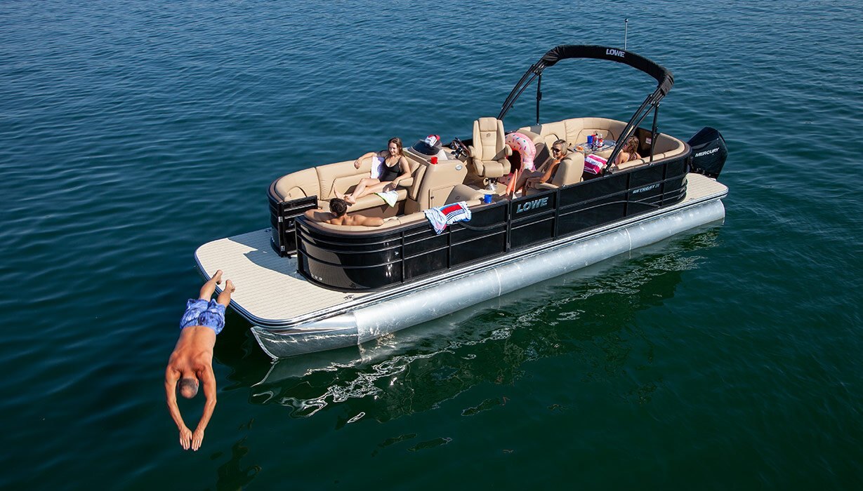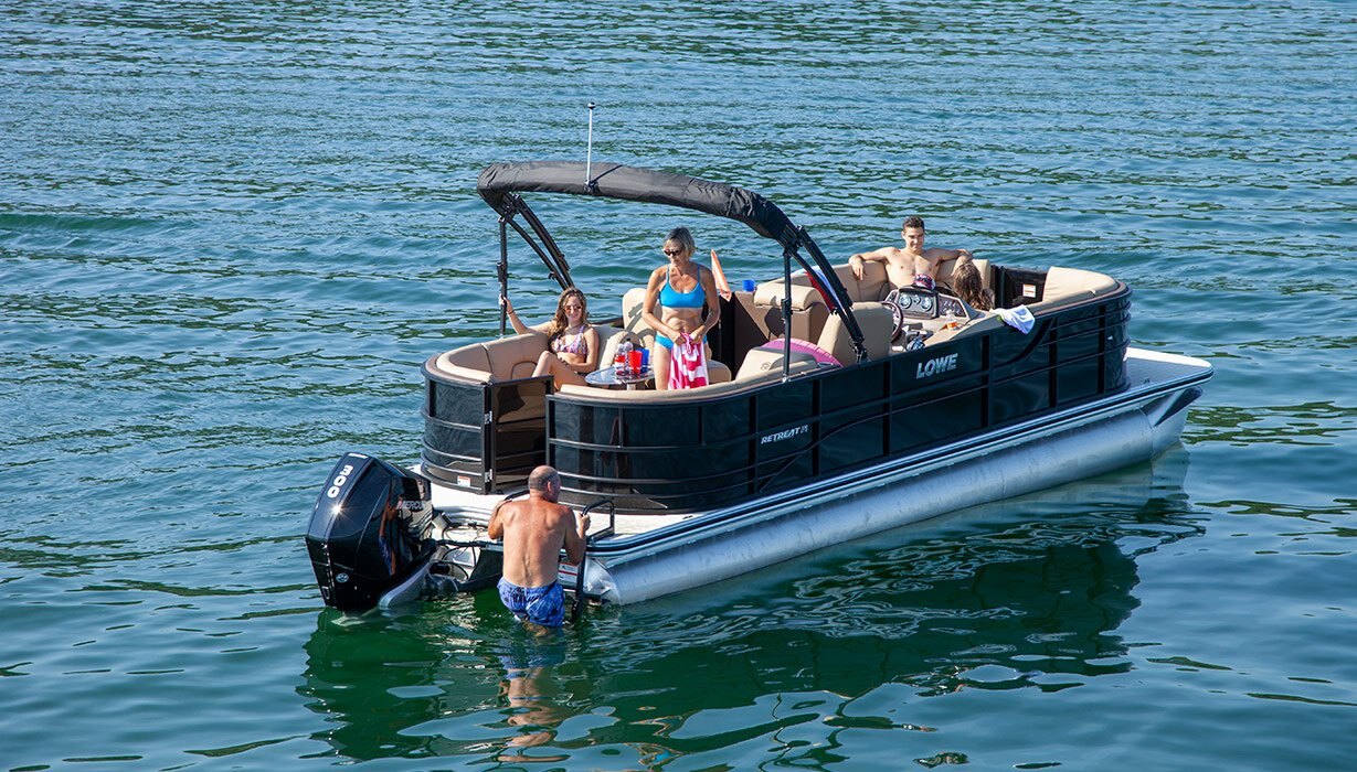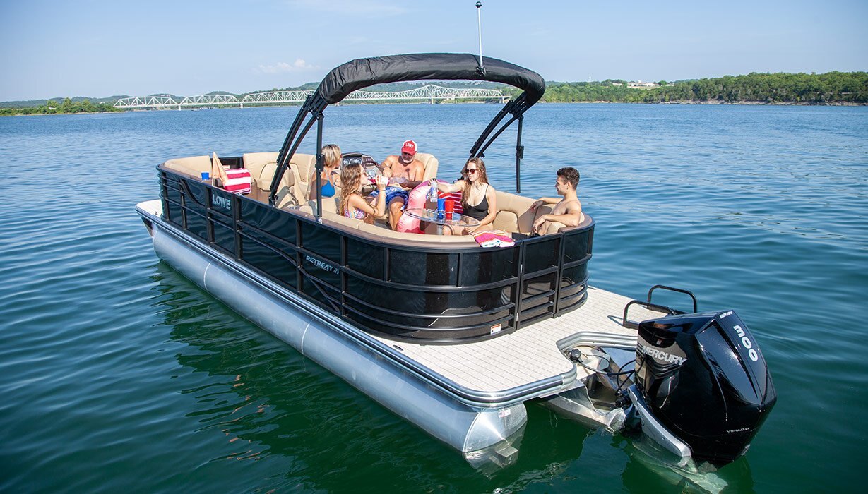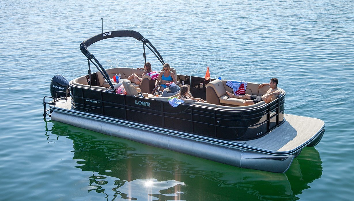 Introducing the all-new Lowe Retreat 270 Extended Walk-Thru pontoon. With massive passenger capacity, premium amenities, a breakthrough walk-thru design, and total freedom to choose from exciting interior and exterior color schemes, the Retreat 270 Extended WT (EWT) is the ultimate entertainer and all-around performer. It features a massive 27-foot-long deck with ample crusing space to carry up to 14 people on board. Tastefully designed, premium furniture with an “open-down-the-middle” floor plan make this the ultimate weekend cruiser in both comfort and convenience. While the Retreat 270 EWT is perfect for evening parties on the water, engine options up to Mercury’s 300-hp Verado combined with Lowe’s Roughwater Package with lifting strakes and a 50-gallon fuel tank make this the hottest performing pontoon package on the market. The Retreat 270 EWT is more than ready to tow skiers, wakeboarders and water toys. A long list of Bimini top and full enclosure canvas options are available, too. Be the “host with the most this summer” with the new Retreat 270 Extended Walk-Thru!