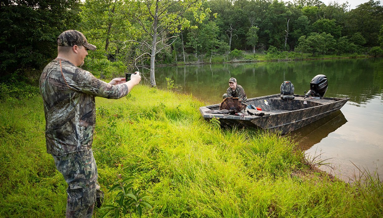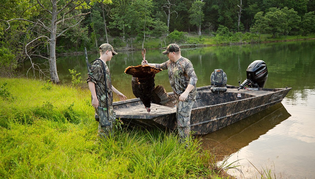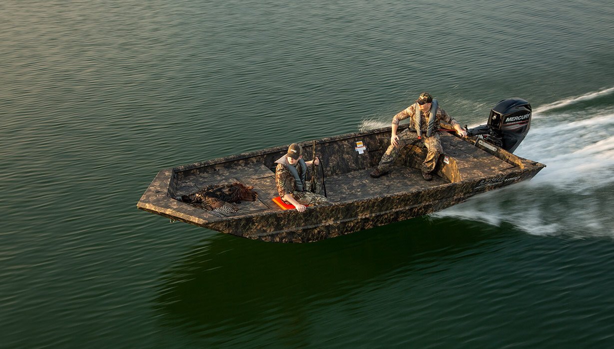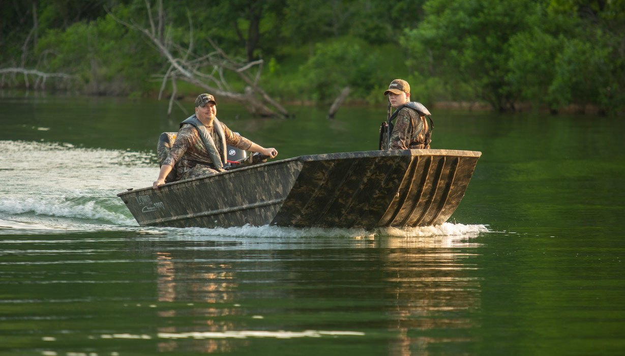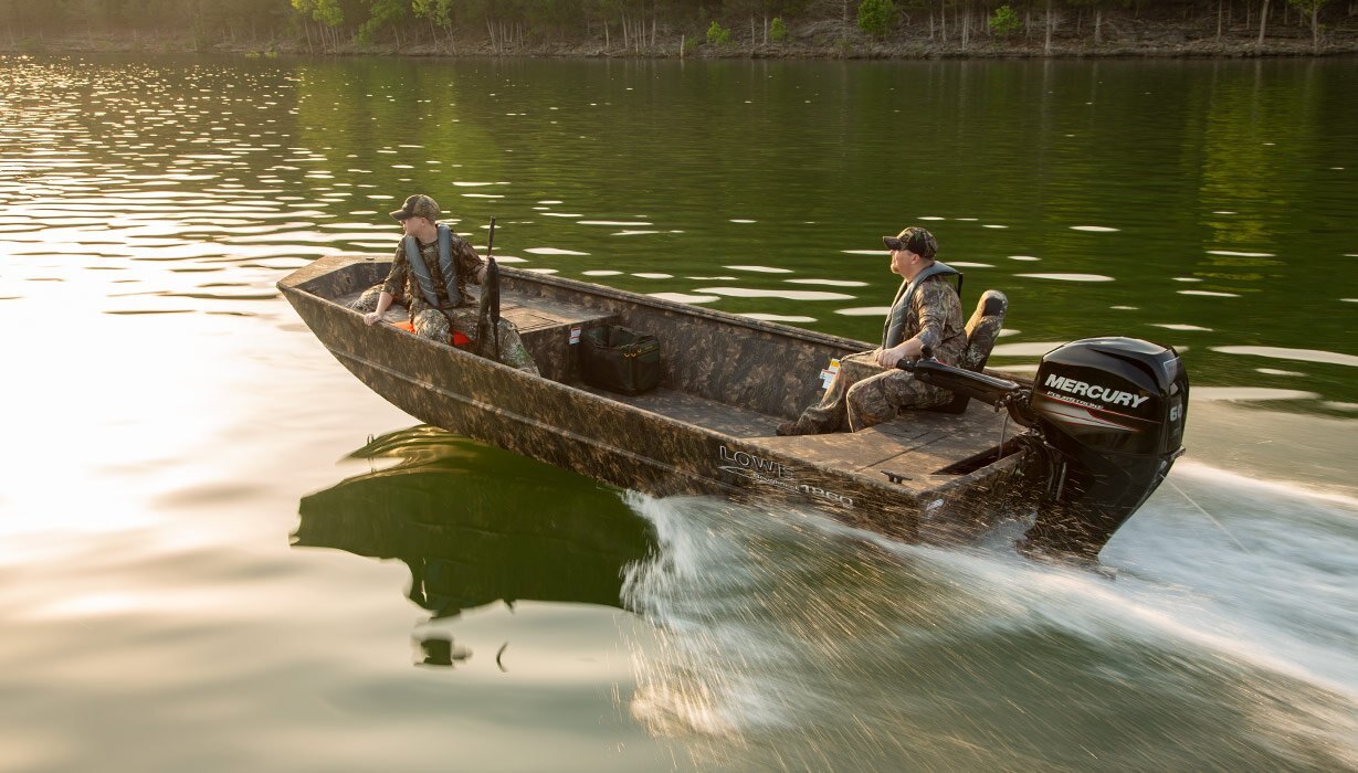 | There’s no need to compromise, thanks to the Roughneck 18DT. This rugged Lowe jon boat earned its nickname, “the in-betweener,” because it offers all the maneuverability of a tiller model with the extended deck of a side console. The cavernous open floor offers room for everything you need. Add a 19-gallon aerated livewell, durable pressed-in cross ribs and a winged rear bench seat, and you have yourself one terrific boat, all for an incredible value. Count on Lowe to keep you in the action. |