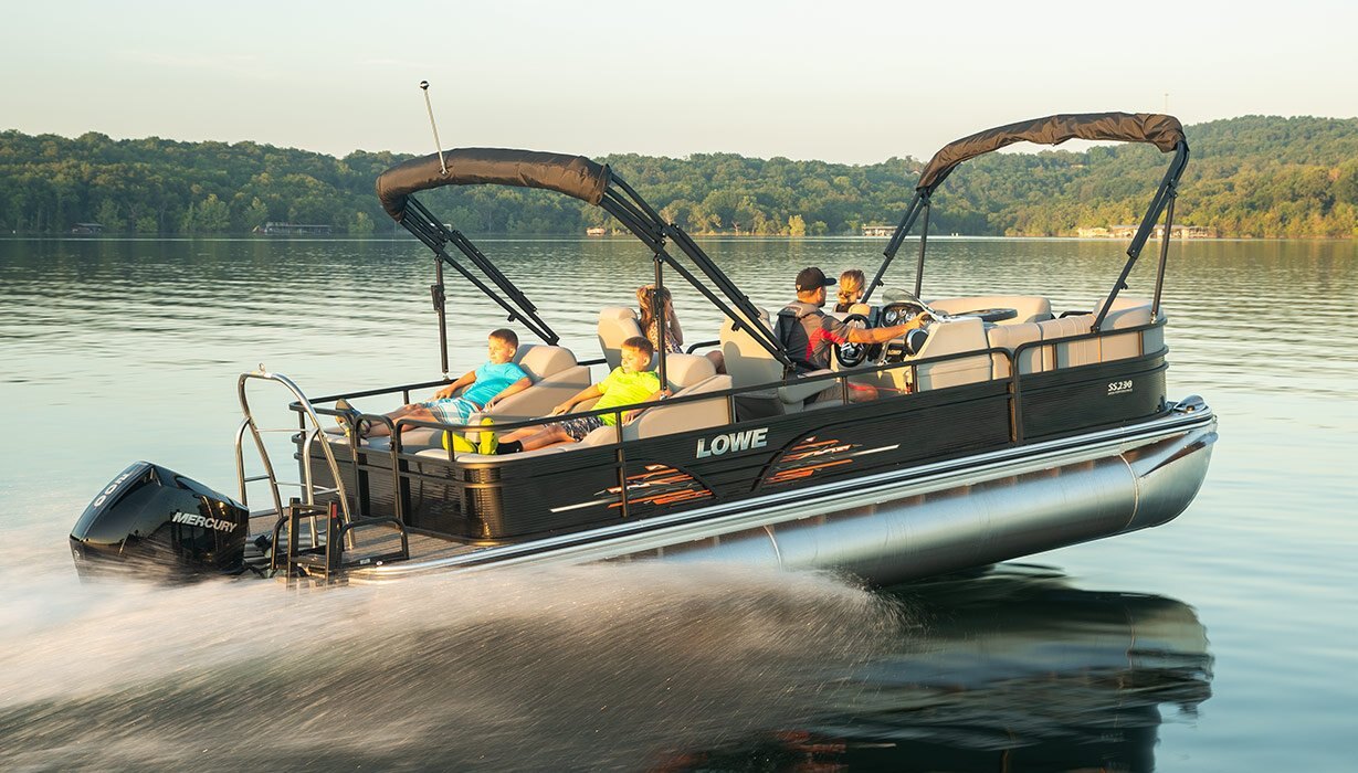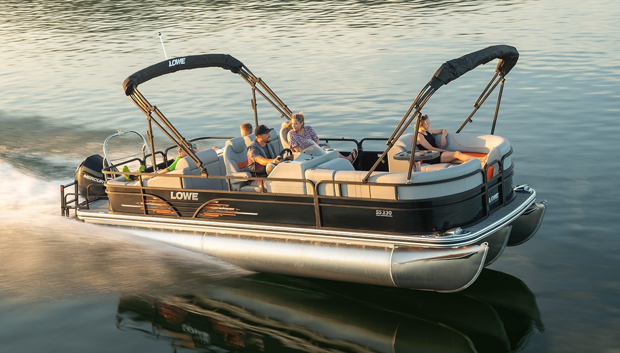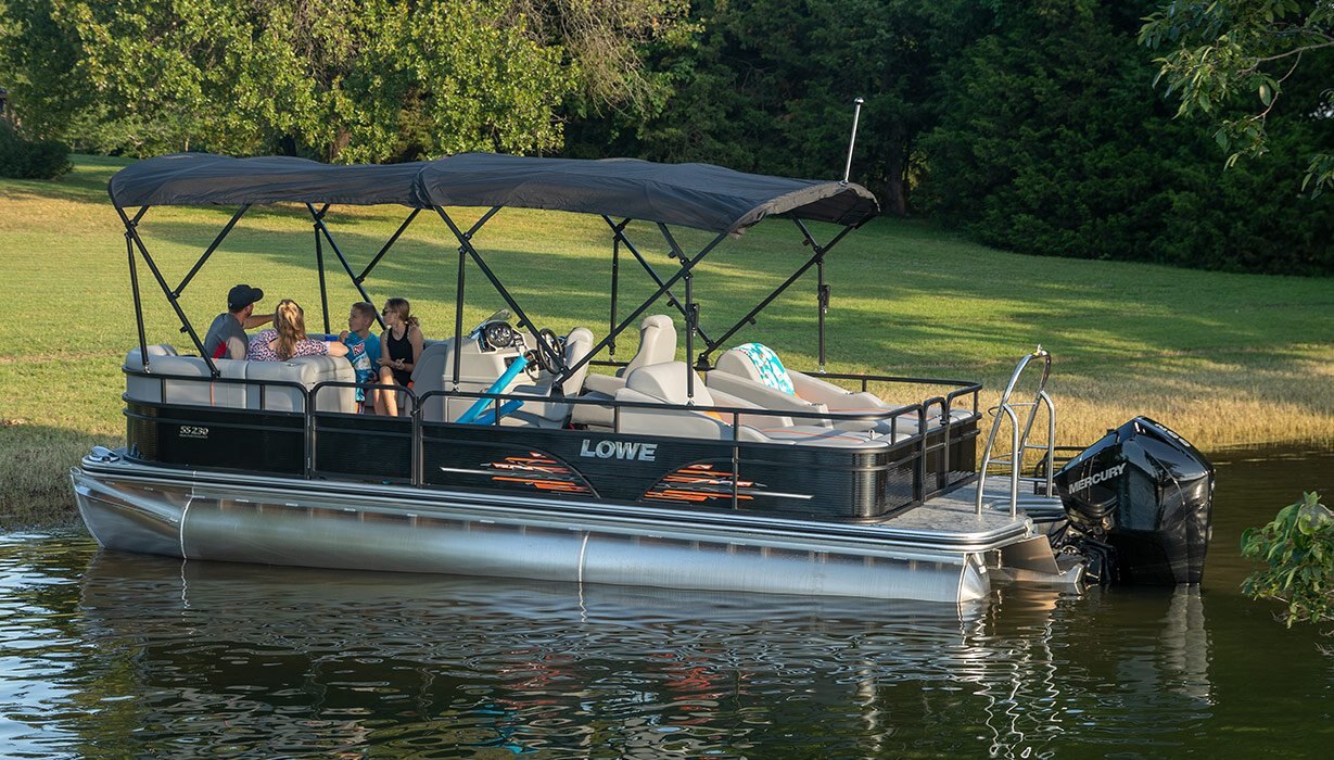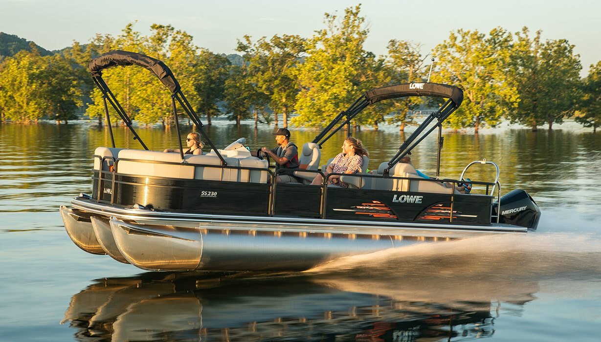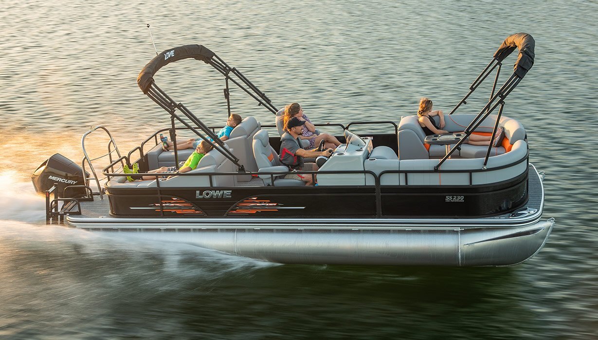 | These days, there’s all kinds of reasons to buy a pontoon boat. And with the all-new SS230 RFL, we may have just given you the best reason yet. We took one of our most popular premium deck configurations, the RFL or Rear Facing Lounge, and brought it to our best-selling SS lineup. Now you can have rear facing comfort and style in a spacious mid-sized cruiser. Two spacious rear facing seats contour your guests in complete comfort while cozy armrests, fence cushions, and stainless steel cup holders indulge their experience. Guests can relax in the sun or watch watersports action from the best seat in the house. The RFL isn’t only comfortable, its loaded with standard features that highlight comfort, style, and fun too. Your guests will appreciate the RFL's convenient cup and storage nooks, new standard vinyl textured flooring, super comfortable front chaise lounges, and Bluetooth® enabled stereo and integrated speaker system. At the helm, an attractive fiberglass console with chrome accents and multi-position helm chair with armrests awaits. And with Lowe Pontoon’s 50 years of pontoon heritage, you can cruise confidently on a quality new pontoon. |