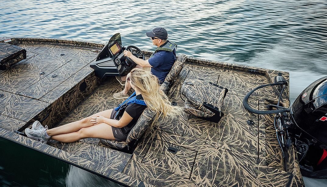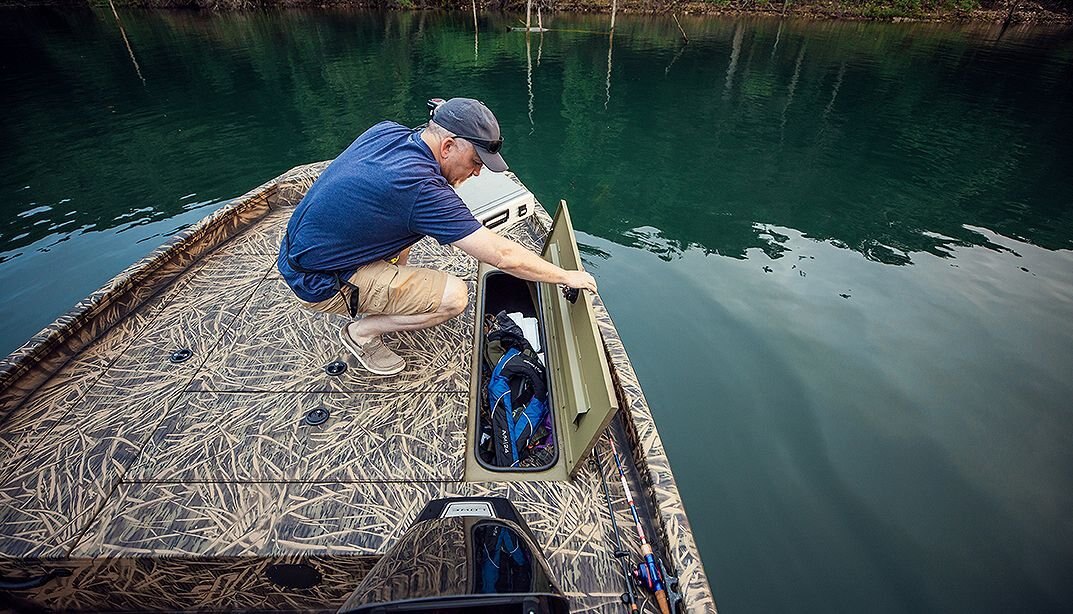 Huge 45.8 sq. ft. bow deck with recessed trolling motor pedal and improved drainage and hatch sealing |