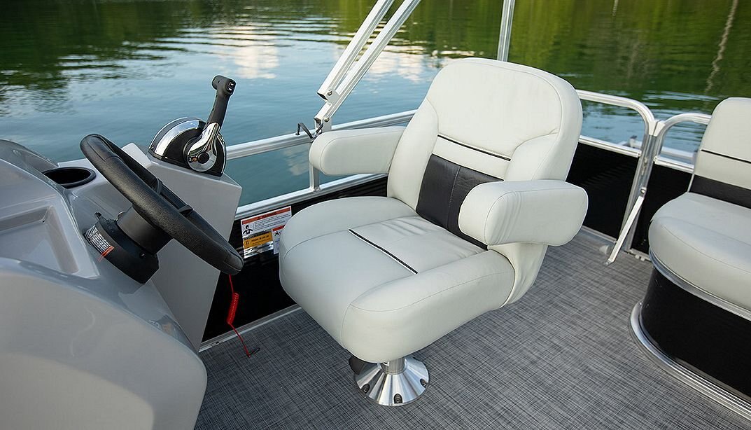 Lowe Ultra pontoons are fitted with gel coated consoles that wont chalk, fade, crack, or turn yellow. The black plastic steering wheel is complimented by the smooth 4:1 anti-feedback steering and the raised footwell.