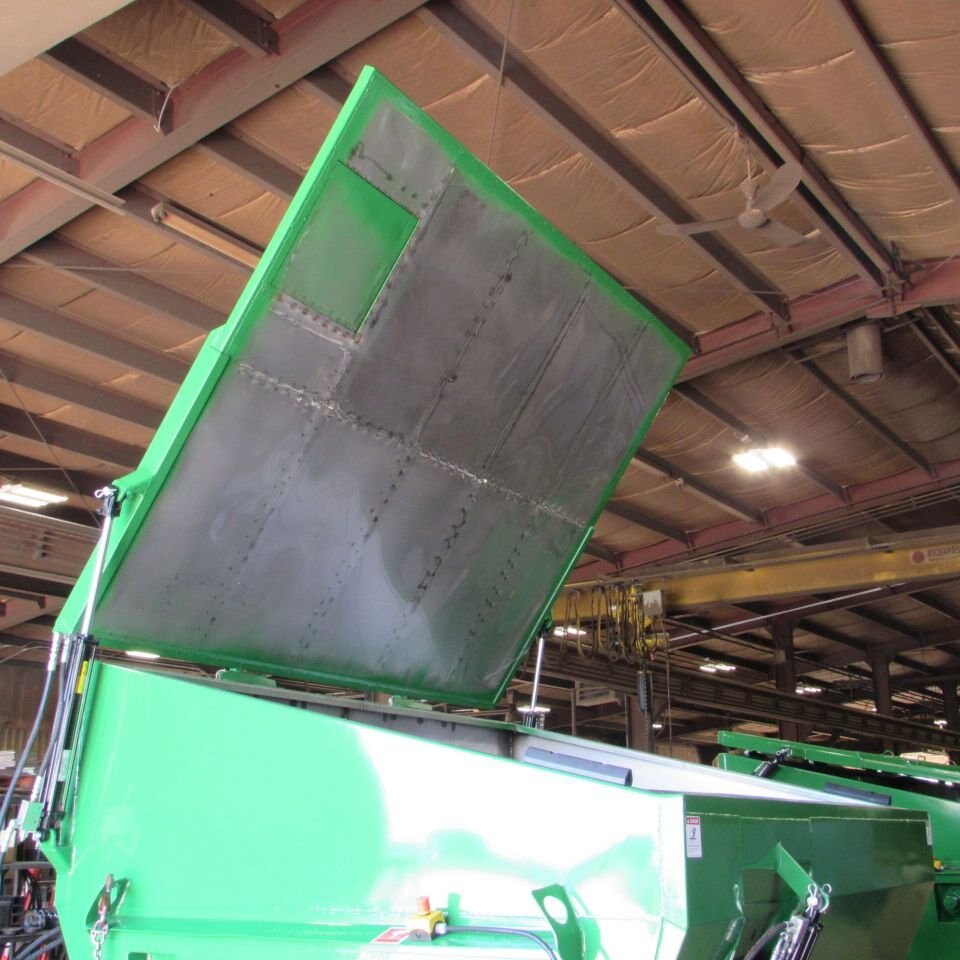 Hydraulically operated roof for loading large amounts with a loader tractor.