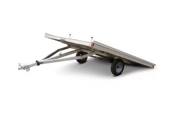 This tilting trailer with room for two snowmobiles makes loading and unloading easy with its quick-release, anti-rattle tilt system. |