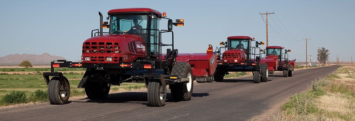 MacDon’s patented Dual Direction® technology (models M205 and M155) allows you to switch to highway travel mode in seconds and travel at highway speeds of up to 23 MPH (37 km/h). Better still, there is no need to detach the header and transport it via flatbed, saving you, even more, time and labor when moving from field to field. (Limitations may occur due to road width restrictions with larger headers.)