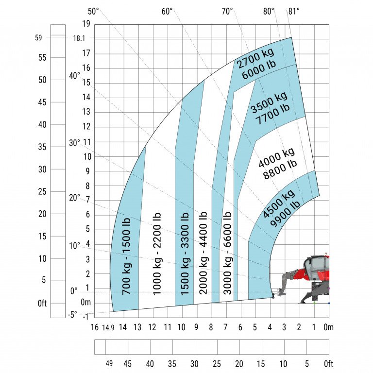 Machine on lowered stabilisers with hook 5000 kg (Metric)