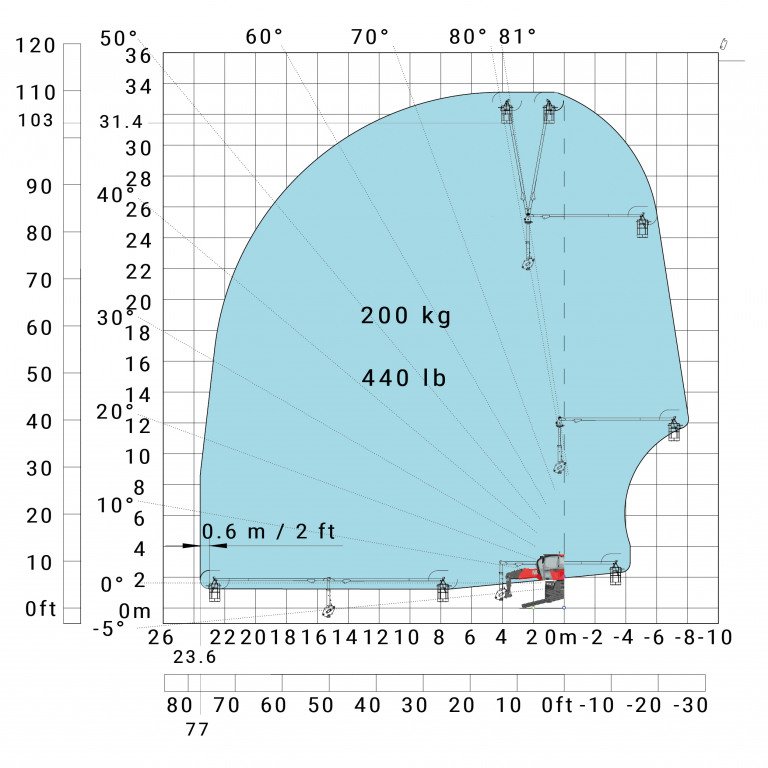 Machine on lowered stabilisers with 1500 kg jib Metric