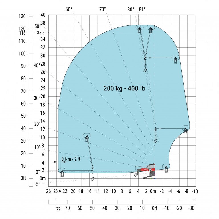 Machine on lowered stabilisers with 1500 kg jib (Metric)
