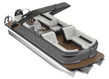 The Explore 24 Switchback Dual Engine with Trifold Bench features a portside switchback lounger with navigator helm. With max capacity, there's room for up to 9 people. This model can be rigged with your choice of dual traditional outboard engines.
