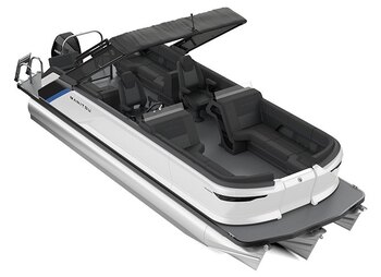 | The Explore 26 MAX Navigator Dual Engine adds comfort where it counts with a full navigator helm and 2 Trifold benches. This model features the game-changing MAX Deck for up to 6 ft of additional floor space, and is rigged with dual Rotax S outboards. |