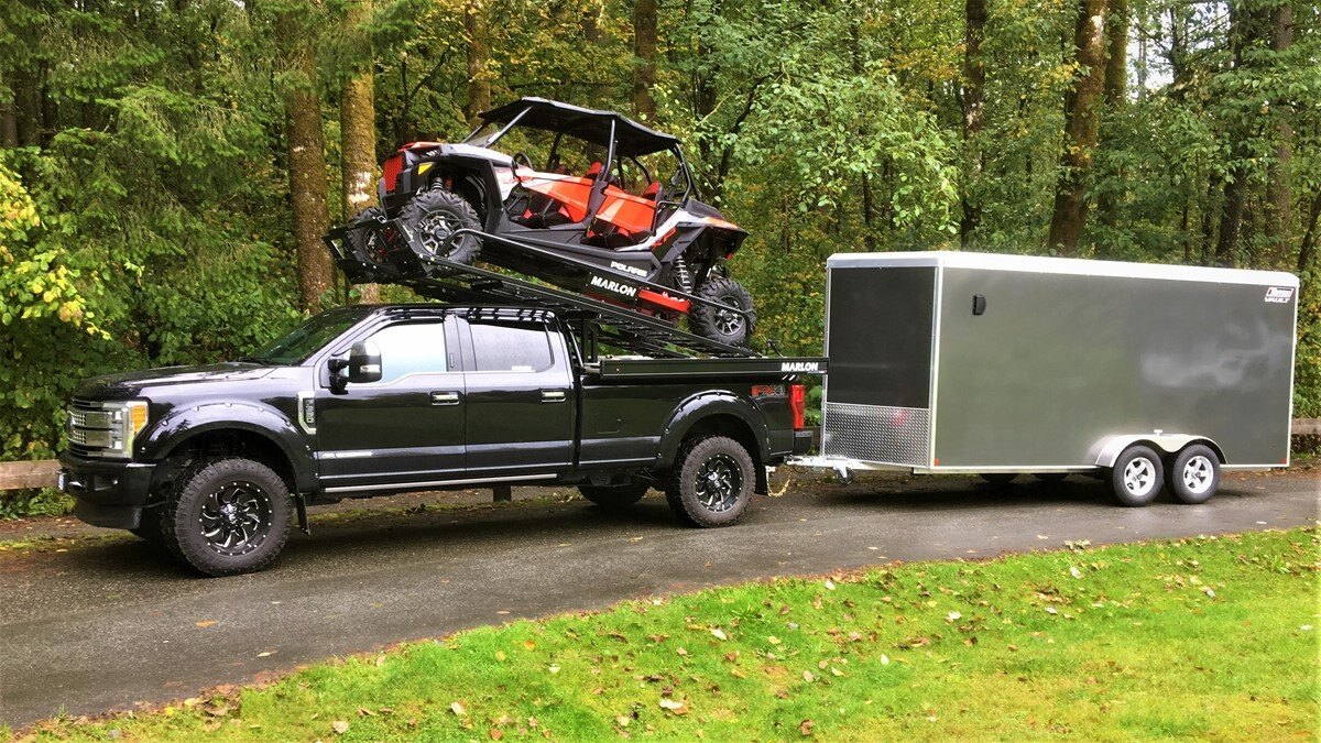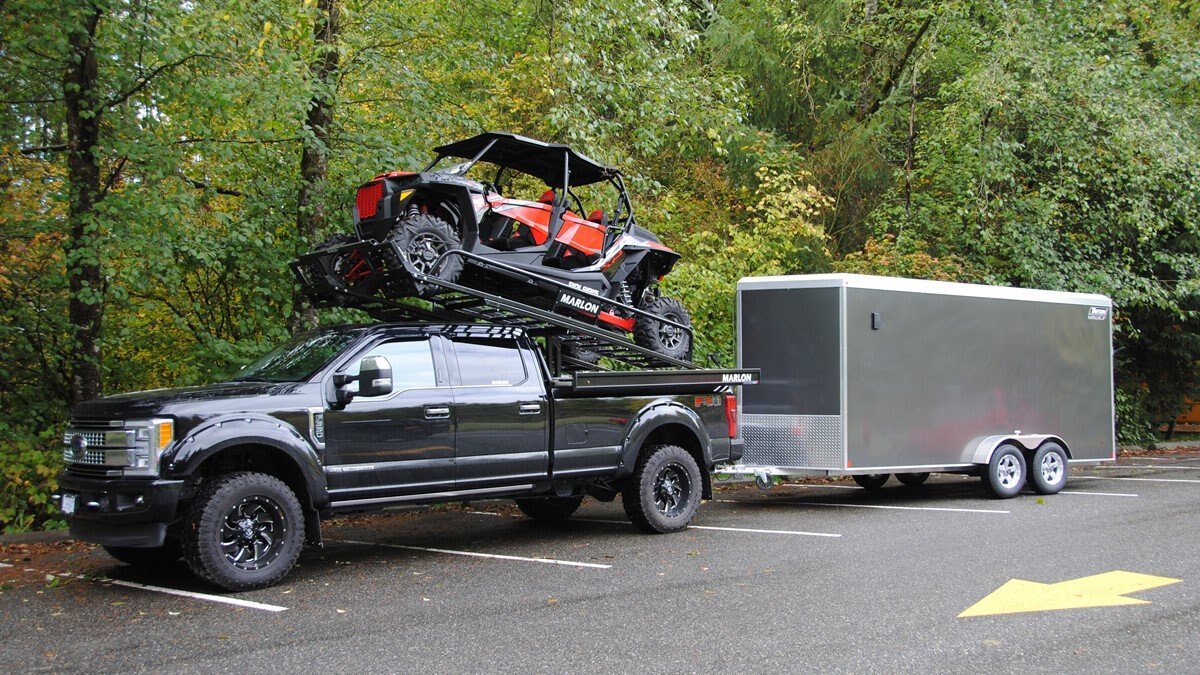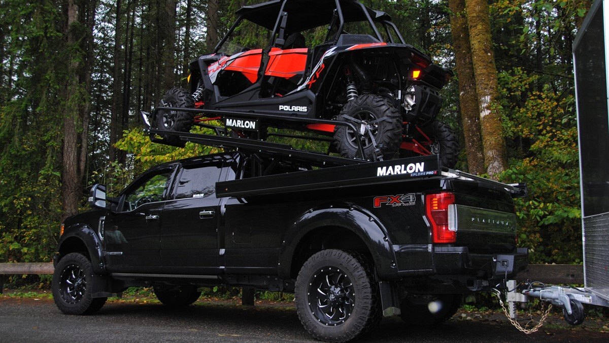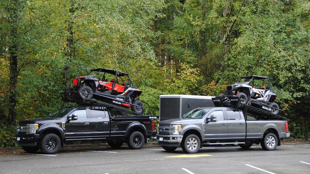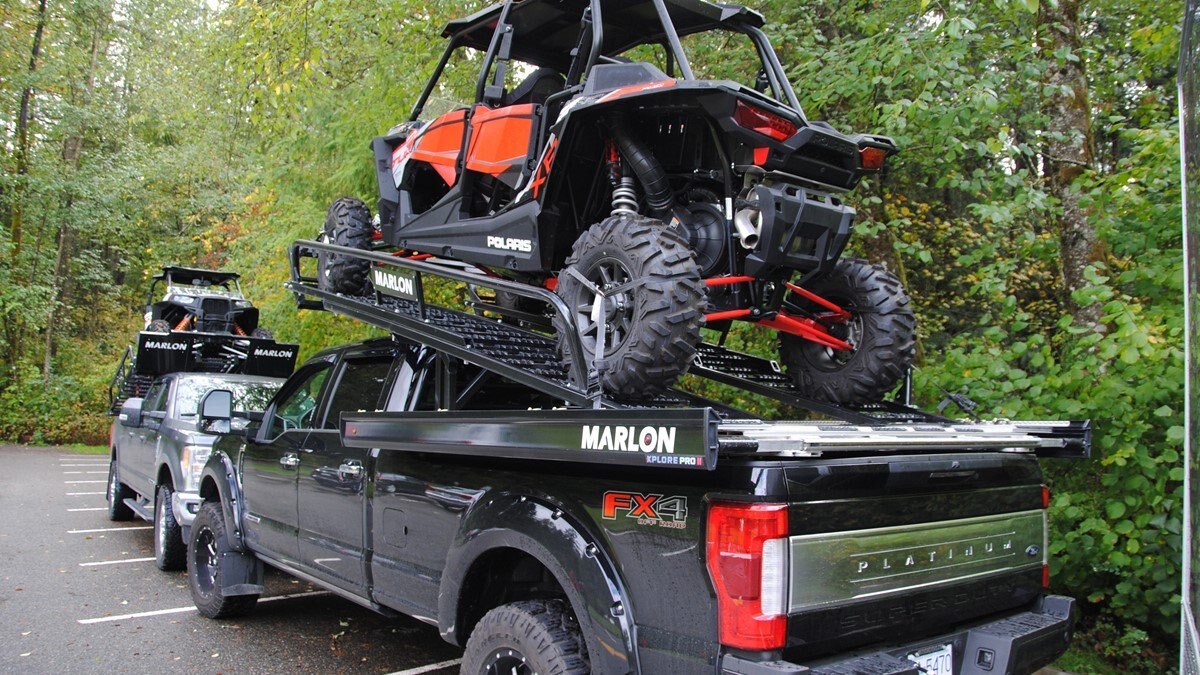 The Marlon Xplore II Riser takes your great Marlon snowmobile deck and transforms it into a great way to get your SxS out for some fun in the dirt and mud. Take your side by side camping, pull an enclosed trailer or pull your boat the choice is now yours! We have all of the side by side machines currently on the market today covered. As a standard configuration the Riser was designed to carry 2 and 4 door side by sides up to 120” max length. With the addition of the Riser Extension you can go to a maximum length of 165”s. Whether your side by side is 50”s wide or 76”s wide the Marlon Riser has you covered! The riser is standard with a number of features our SxS deck is famous for. Features like the positive park front tire cradles, Marlon’s unique tire tie down system, Marlon’s traction grips, side safety loading bars, winch plate or securement point to use your side by side winch to pull your machine on if need be. The 2018 Marlon snowmobile decks come with a new telescoping snowmobile ramp that has been designed with new extrusions to incorporate the wide superglides for the wider snowmobile stances and the 50” wide side by sides. For the larger machines we have optional 10’ or 12’ single folding ramps the choice is yours. Get your riser and go Xplore!