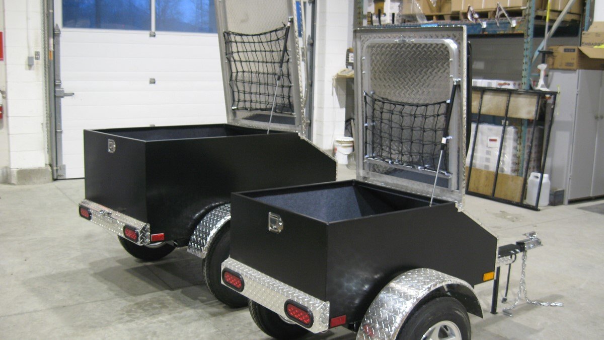 The Marlon AMT Aluminum Motorcycle Trailer is built with an aluminum frame, painted aluminum body with attractive aluminum checker plate accents. Comes with interior carpeted floor & walls also a standard baggage rack.