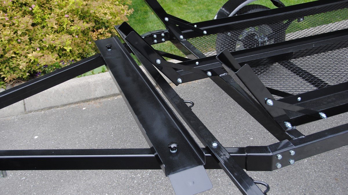 Oversized heavy-duty trailer frame with mesh floor, for novice or experienced users who would like the extra security of extra stepping space when loading and unloading.
