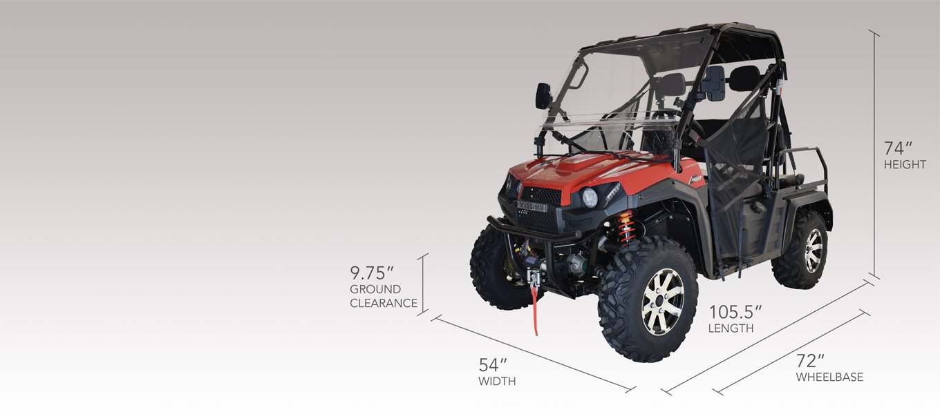 • Vehicle Size (L x W x H): 105.5 in x 54 in x 74 in