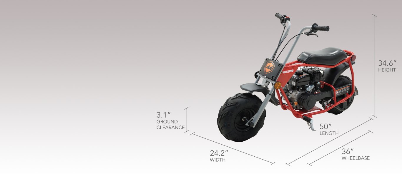 • Vehicle Size (L x W x H): 50 in x 24.2 in x 34.6 in• Wheelbase: 36 in • Ground Clearance: 3.1 in • Fuel Capacity: .36 gallons • Seat Height: 23.6 in • Dry Weight: 77 LBS |
