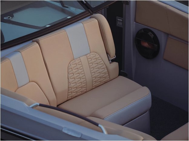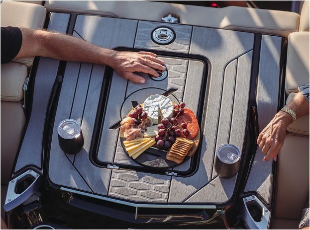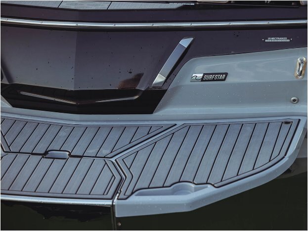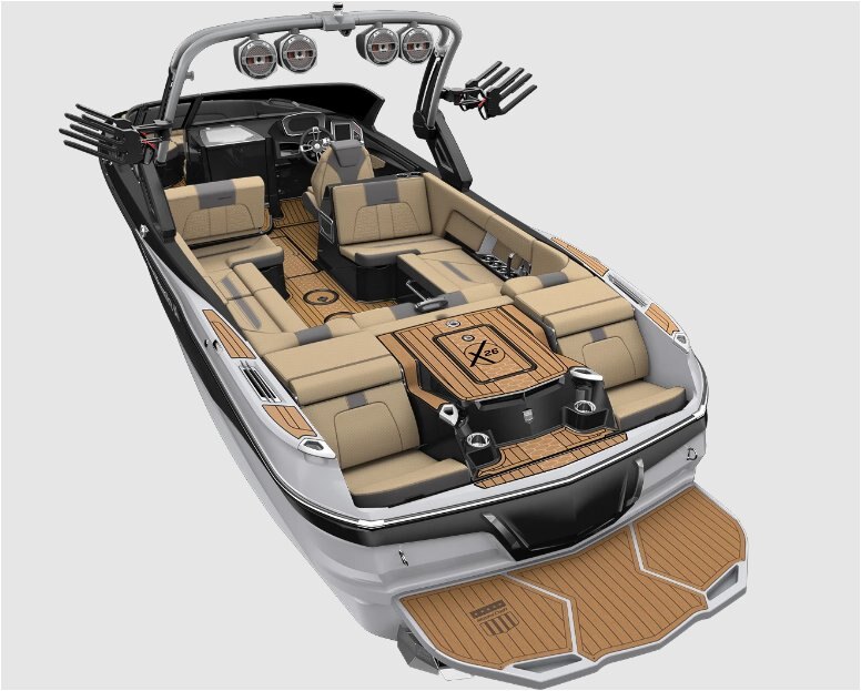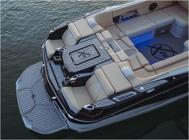 PREMIUM AMENITIES The X26 offers the most luxurious amenities on the market. From the available refrigerator and head to the ergonomic and patented transom lounge seats, this is an elevated towboat experience. All-new for 2023, enjoy the flip-down swim step that makes getting in and out of the water easier than ever before. |