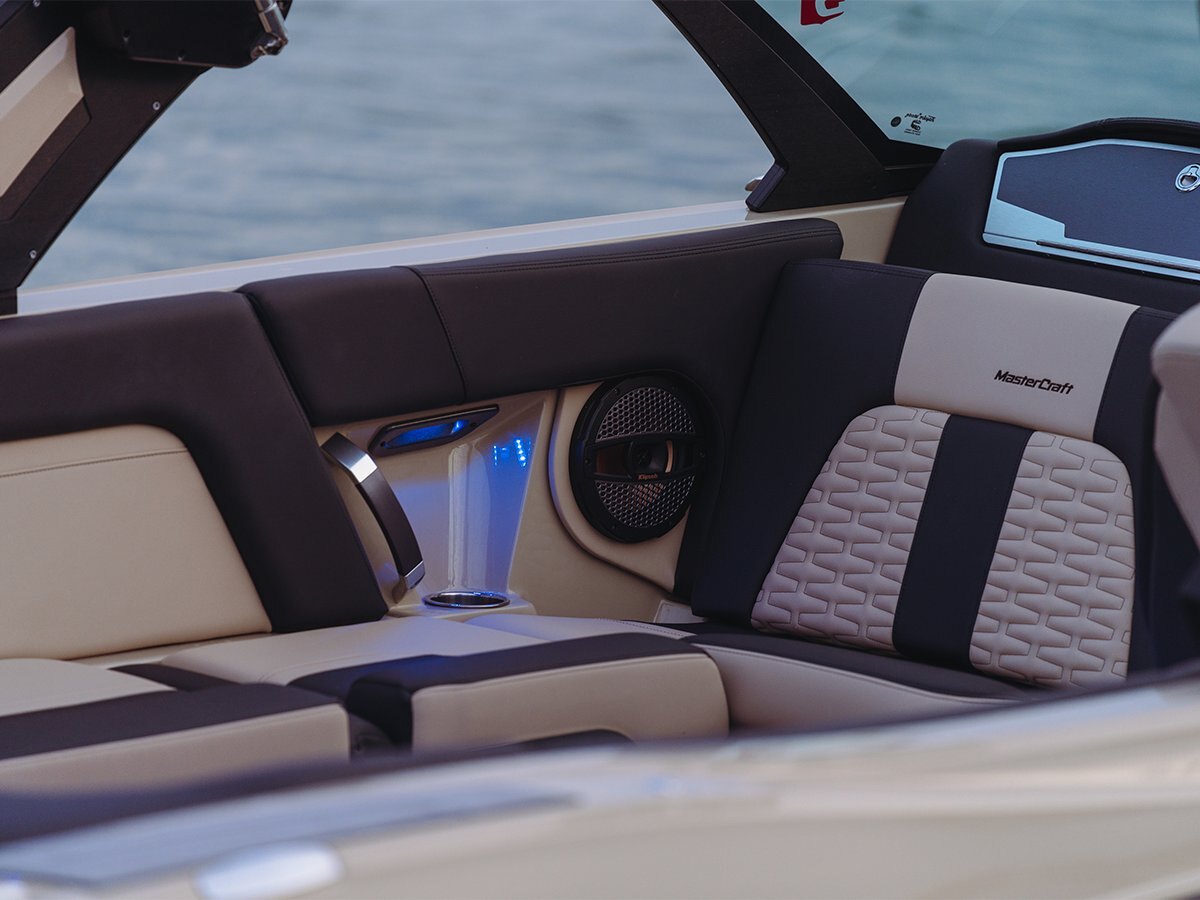 Experience the exceptional level of fit-and-finish that is synonymous with MasterCraft. With our signature pickle fork bow, higher freeboard, and stunning style lines, the X24 provides the smoothest ride in its segment with eye-catching design details. And with CoolFeel, you can opt for rich colors like Jet Black or Coconut Brown and keep up to 30% cooler than traditional upholstery even on the hottest days. |