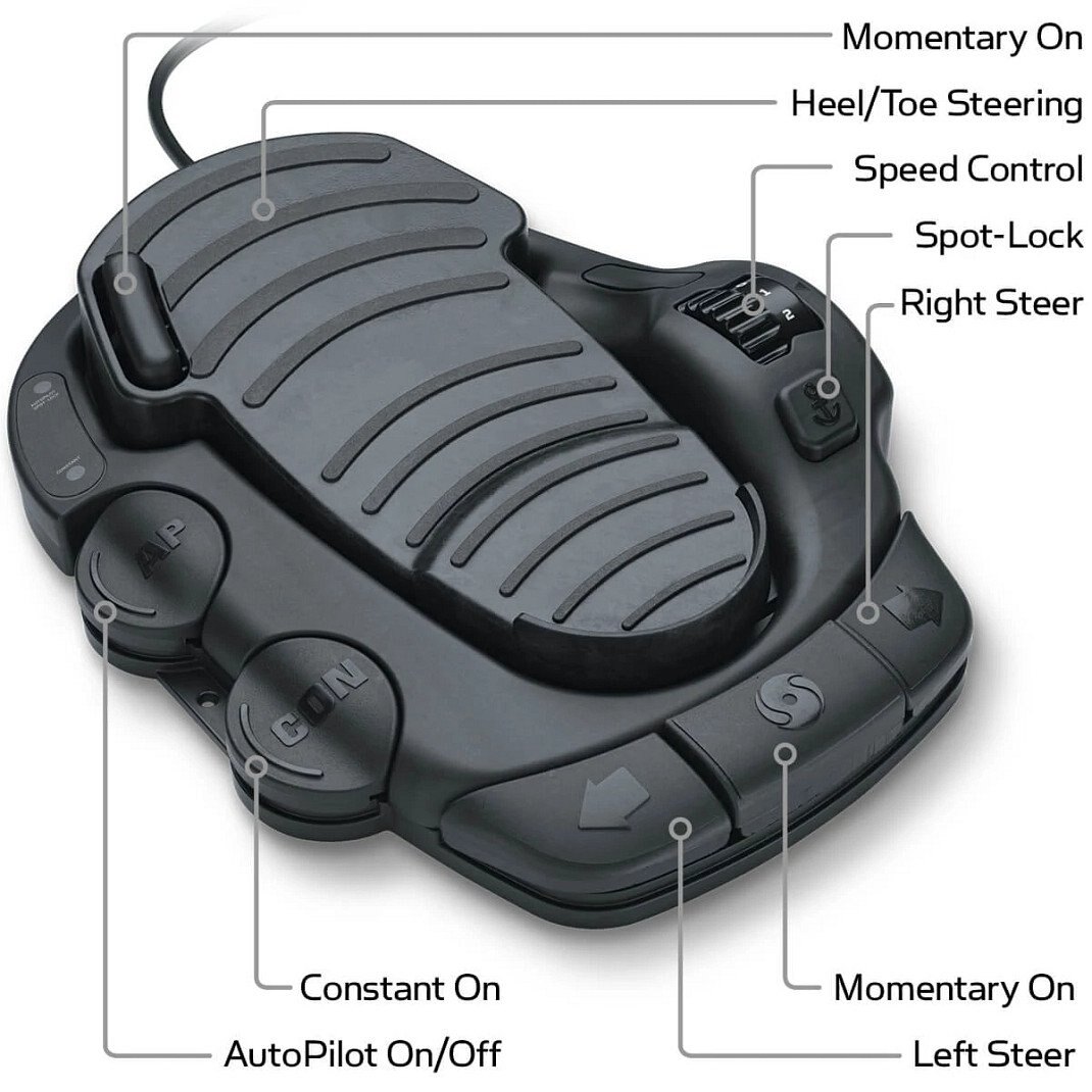 - Electric Foot Pedal: Low-profile design offers two steering options: heel/toe pedal and left/right steering buttons. Includes Spot-Lock activation, rotary speed control dial, momentary/constant on toggle, AutoPilot on/off toggle and 18' cable with waterproof connector plug.