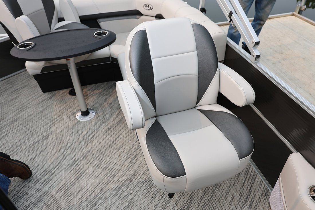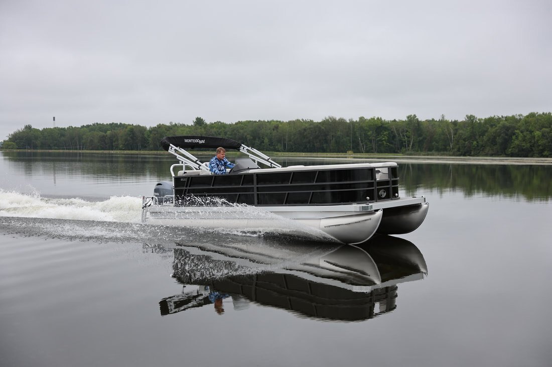 | Our Deluxe Cruising Pontoons are made up of 11 models covering 16, 18, 20, 22 and 24 feet. In the 20, 22 and 24 foot models you will see a variety of layouts to choose from. We designed swim platform models which allows you to store tubes and coolers, etc on the back and make them easy to ski from. Like all Montego Bay pontoon models, they feature the highest quality materials and construction methods and techniques. All of which leads to a finished product that exceeds the performance, luxury and quality equation found in competitive brands. All of these luxury barges come with stereo, deluxe console, windshield, etc. all standard features.Our C8522-BR 22' model with a full back radius design and king chair has become one of our most popular models. |