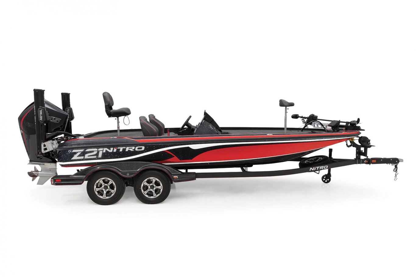 Custom-fit, tandem-axle NITRO® trailer powdercoated w/GALVASHIELD® Impact corrosion & chip protection for improved durability NEW lockable storage box that will hold folding 4-way cross wrench & chocks (not included) 7-pin connector 14" (35.56 cm) custom aluminum wheels w/radial tires Surge disc brakes on both axles No Touch Vortex hub lubrication system w/6-year, 100,000-mile (1,609.34 km) limited warranty Spare tire carrier w/matching spare All-welded rectangular GALVASHIELD® frame Space-saving swing-away tongue to reduce storage length 1,600-lb. (725.75 kg) swing-up locking jack w/swivel wheel Heavy-duty winch w/nylon strap & bow safety strap Integrated winch stand step w/safety handle for easier boarding/reboarding at bow while boat is on trailer Outboard motor support to reduce hull & transom stress while towing Fiberglass fender design w/integrated back-up lights Carpeted bunks & fender boards to protect hull Submersible LED lights Safety cables