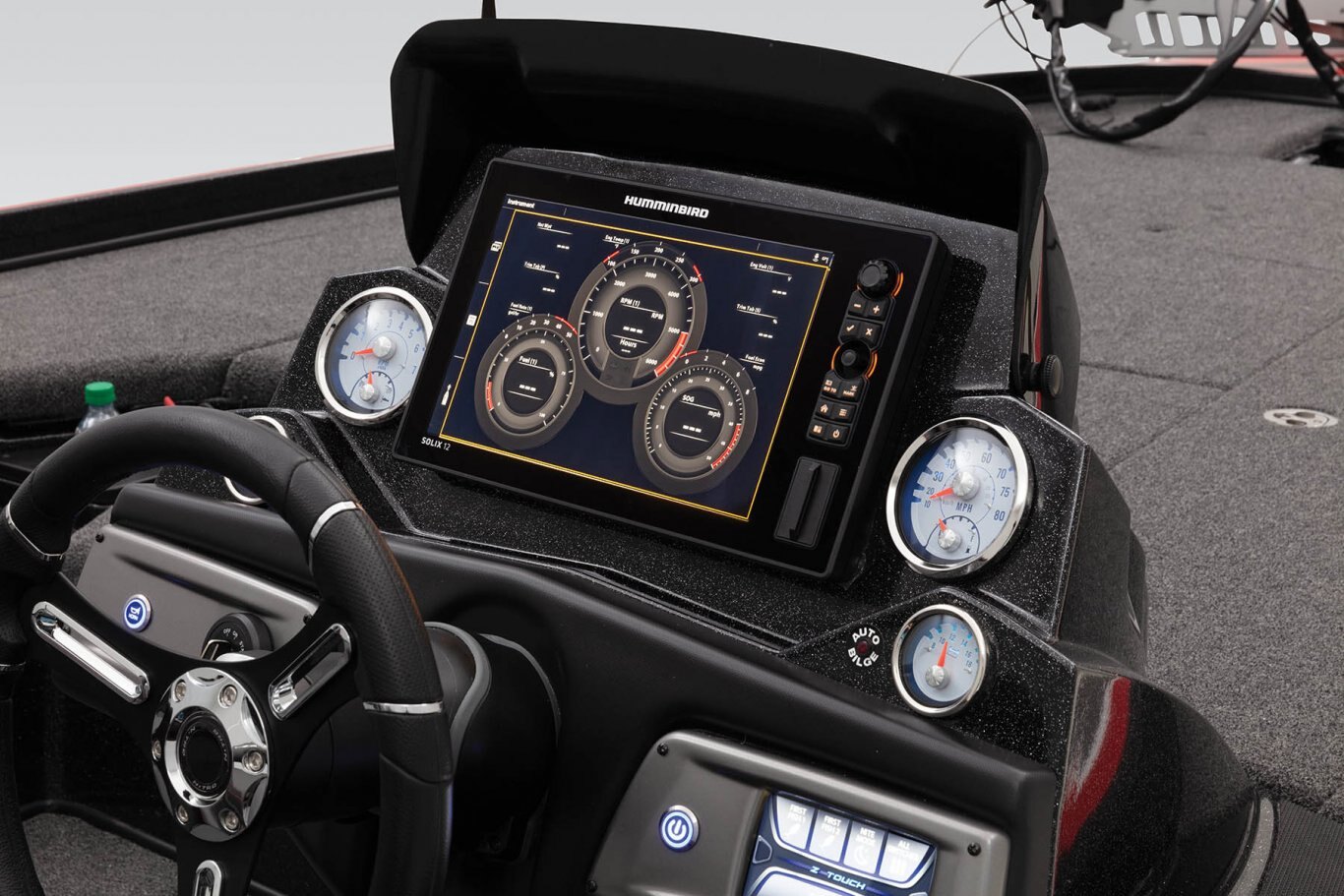 16° variable deadrise hull w/RAPID PLANING SYSTEM™ (RPS™) Bow Humminbird® SOLIX™ 10 DI G2 gimbal-mounted fishfinder Console Humminbird® SOLIX™ 12 SI G2 flush-mounted fishfinder w/MEGA Down Imaging 2 Minn Kota® 10’ (3.05 m) Talon shallow-water anchors—Black (bracket mounted, dealer installed) Minn Kota® Ultrex® 36V, 112-lb. (50.8 kg) thrust, 45” (1.14 m) shaft trolling motor w/MEGA Down Imaging & i-Pilot® Link™ Hydraulic folding fishing seat & hydraulic bike seat Z-CORE™ seating system w/Force Flex suspension & power-adjust pneumatic lumbar support for driver’s seat Low driver & passenger flat seat mounting 100% composite deck core w/superior thermal stability & strength-to-weight ratio 3-way Ethernet communication between fishfinders & trolling motor Livewell culling system Factory-applied keel protector 2 automatic bilge pumps Hot Foot™ throttle & Pro-Trim lever 4-bank, 40-amp battery charger 1 extra trolling battery Low-profile gunnels to maximize deck size & for easier casting Bow panel w/trolling motor receptacle, anchor/light switch & trim switch 45-sq.-ft., (4.2-sq.-m) anti-fatigue, padded bow deck w/port & starboard rod lockers w/lift assists for rods up to 8' (2.44 m) & center storage locker w/TACKLE MANAGEMENT SYSTEM™ Tapered rod tubes in port rod locker to protect rod tips 2 large, lockable center bow storage lockers w/lift assists Bow port & starboard rod hold-down straps Step to bow deck w/86-qt. (81.39 L) insulated cooler, removable trash receptacle & snap-in sandwich tray Port below-console pull-out storage drawer Modular, aerodynamic console design w/expanded leg clearance & large fishfinder surface Console removable acrylic tinted windscreen, 2-tone gelcoat & LED courtesy light Veethree® multifunction instrumentation & digital switch panel w/Blue backlight & soft-touch shroud Hydraulic steering w/tilt Below-console RAM® X-Grip® phone holder Footrest w/non-skid mat under console Partner rod ramp w/rod handle organizer & hold-down strap Designated net storage behind seating 2 insulated aft 19-gal. (71.92 L) GUARDIAN™ livewells w/digital timers 2 lift-out, molded aft storage boxes that will each accept seven 3700 tackle trays Lift-out tool/rope storage tray in rigging compartment 12" (30.48 cm) adjustable jack plate Integrated, angled fold-down stainless steel reboarding ladder Interstate® batteries: 1 cranking & 2 trolling (total) Custom-fit trailer powdercoated w/GALVASHIELD® Impact protection, w/retractable transom tie downs