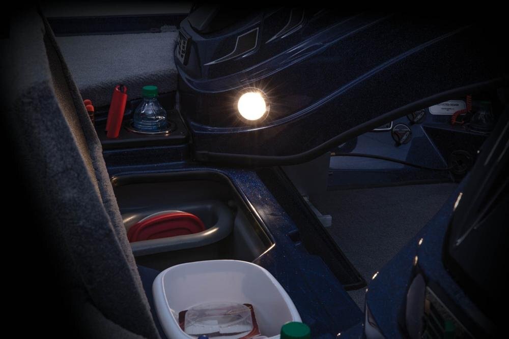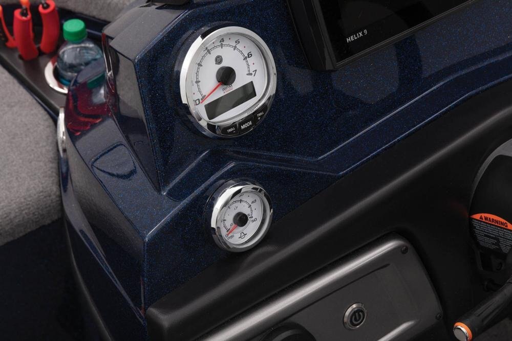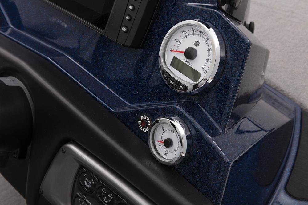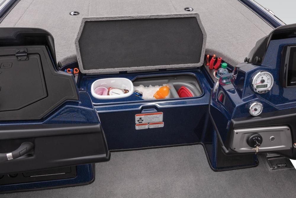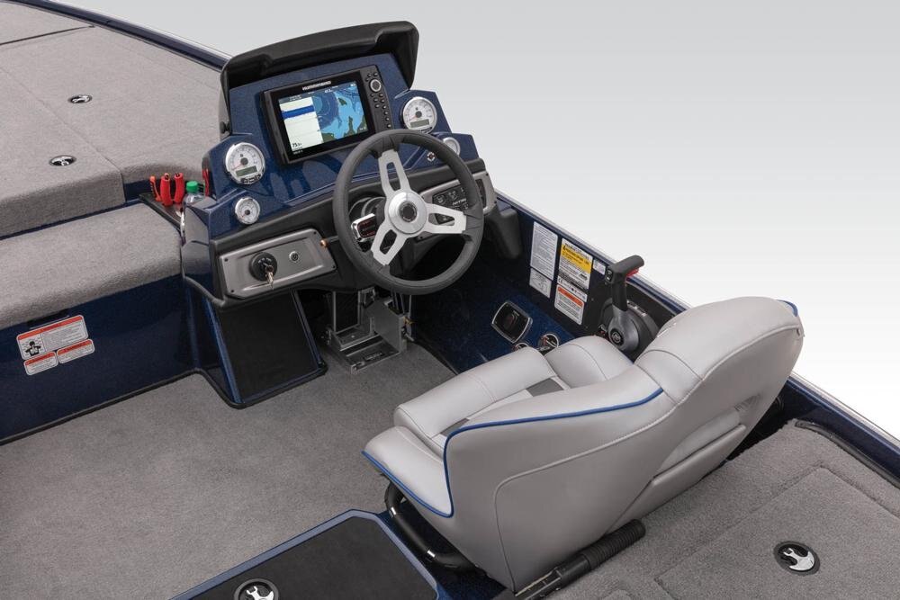 Modular, aerodynamic console design w/expanded leg clearance & large fishfinder surface NEW Lowrance® HOOK Reveal 5C flush-mounted fishfinder Hydraulic steering w/tilt Removable acrylic, tinted windscreen Ready to accept optional removable port console Veethree® multifunction instrumentation w/speedometer/fuel gauge, tach/trim gauge, voltmeter gauge & water pressure gauge Dash light dimmer Waterproof, capacitive touch digital keypad LED courtesy light 12V outlet