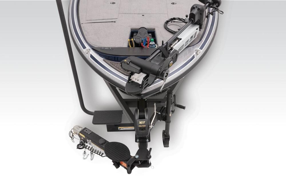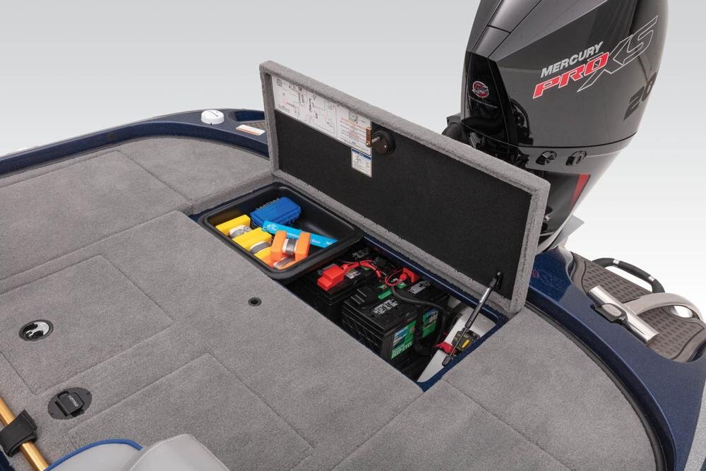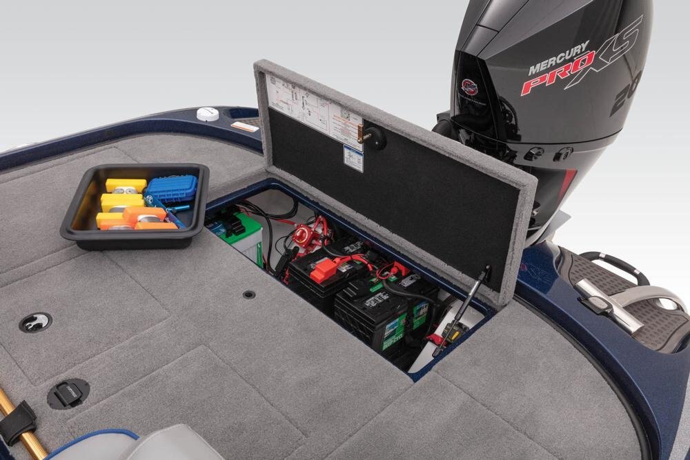 NEW angled bow panel w/trolling motor receptacle, anchor/light switch, trim switch & capability to flush mount 10" (25.4 cm) fishfinder LED console courtesy light Manual LED-lighted bow gear storage Automotive-style labeled fuse panel w/cover Interstate® cranking battery 2 heavy-duty Interstate® trolling batteries 2-bank, 8-amp battery charger w/exterior receptacle 6-gauge trolling motor wiring w/50-amp circuit breaker Master power switch Waterproof Deutsch plugin gauge connectors Water/abrasion-resistant connectors