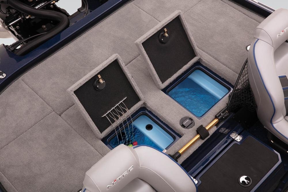 2 aft 19-gal. (71.92 L) insulated GUARDIAN™ livewells w/digital timers NEW starboard livewell lid w/culling bracket 750 GPH (2,839.06 LPH) livewell recirculation/pump-out system 500 GPH (1,892.71 LPH) aerator/fill pump Dual remote drain controls Rotomolded w/rounded corners