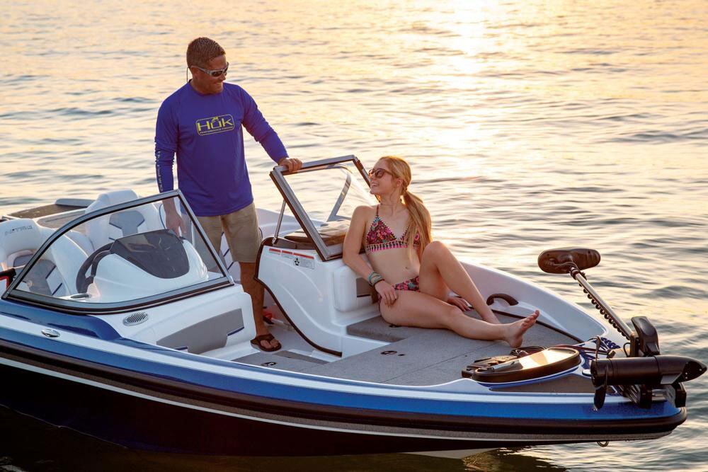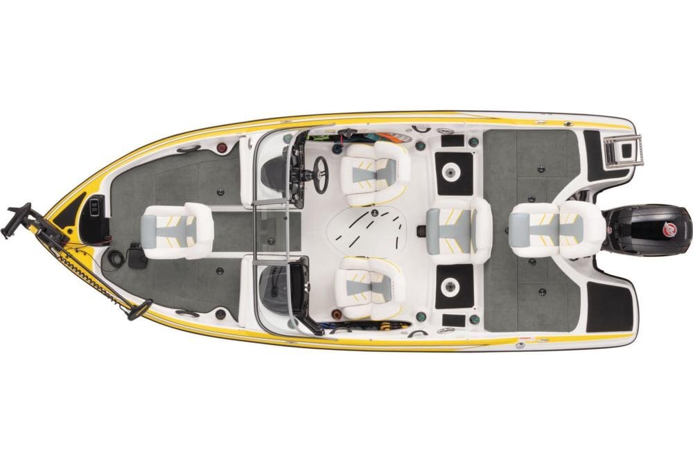 16° variable deadrise hull Lowrance® HOOK Reveal 5C flush-mounted fishfinder Minn Kota® PowerDrive™ 12V, 55-lb. (24.95 kg) thrust, 54" (1.37 m) shaft foot-control trolling motor w/Universal Sonar 2 Z-CORE™ seating system w/Force Flex suspension & contoured, rotomolded frame for driver & passenger seats 100% composite deck core w/superior thermal stability & strength-to-weight ratio Bow port & starboard bolsters Forward in-floor rod locker w/organizer Custom-molded port & starboard consoles w/radiused walk-thru, tempered-glass windshield Cockpit courtesy lighting Veethree® multifunction instrumentation & water-resistant switch panels Midship in-floor wakeboard/ski storage Aft bench seating w/2 convertible, removable fishing seats 44-qt. (41.64 L) insulated cooler below aft seat Full-width, lockable rod/ski storage in aft deck Aft 16-gal. (60.57 L) rotomolded & aerated livewell w/timer, pump-out system & rounded corners 2 aft storage compartments w/drop-in boxes Removable tournament-style ski pylon Port & starboard swim platforms w/integrated boarding ladder Interstate® batteries: 1 starting & 1 trolling Custom-fit trailer powdercoated w/GALVASHIELD® Impact protection